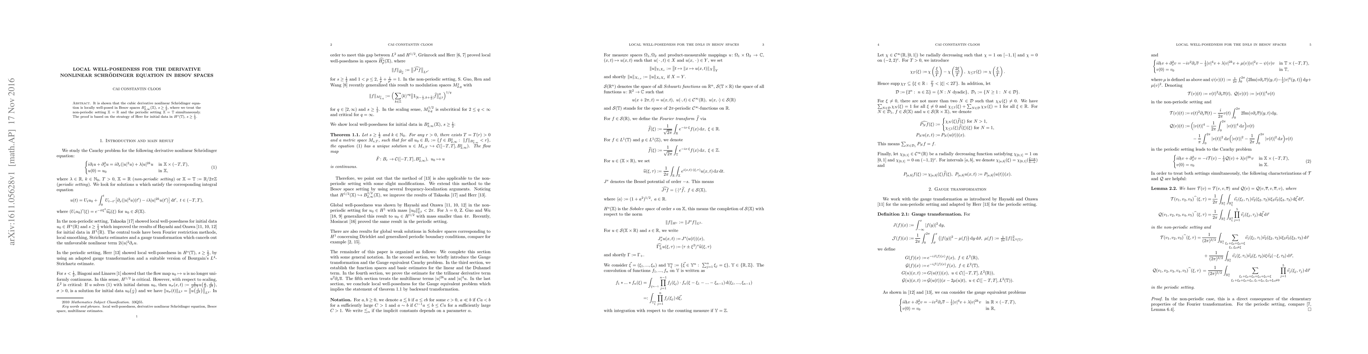 It is shown that the cubic derivative nonlinear Schr\"odinger equation is locally well-posed in Besov spaces $B^{s}_{2,\infty}(\mathbb X)$, $s\ge\tfrac12$, where we treat the non-periodic setting $\mathbb X=\mathbb R$ and the periodic setting $\mathbb X=\mathbb T$ simultaneously. The proof is based on the strategy of Herr for initial data in $H^{s}(\mathbb T)$, $s\ge\tfrac12$.