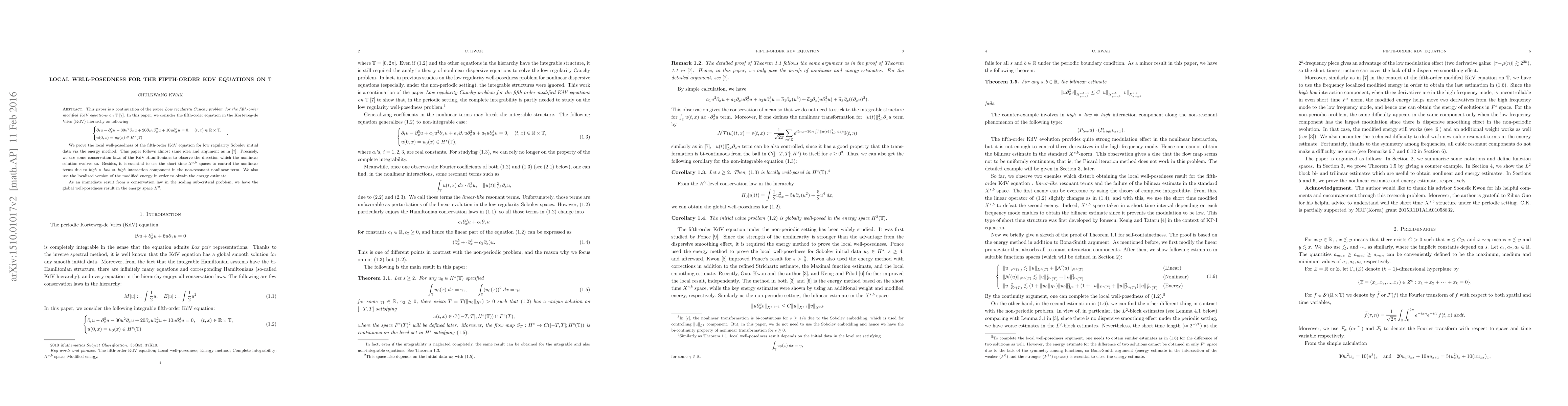 This paper proves local well-posedness for the fifth-order KdV equation with low regularity initial data using the energy method and conservation laws. It leverages $X^{s,b}$ spaces and a localized modified energy to manage high $\times$ low interactions and achieve an energy estimate, ultimately yielding global well-posedness in $H^2$.