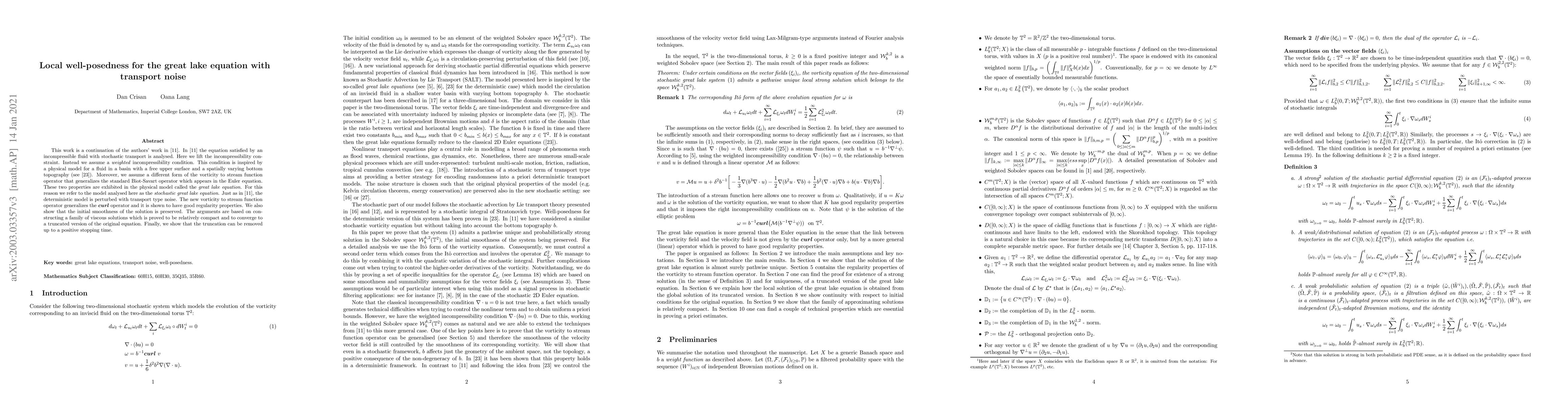 This paper investigates local well-posedness for the stochastic great lake equation, which generalizes the 2D Euler equation by lifting the incompressibility constraint and introducing a weighted incompressibility condition. The study also introduces a new vorticity to stream function operator that generalizes the standard Biot-Savart operator, ensuring good regularity properties and preserving initial smoothness of solutions.