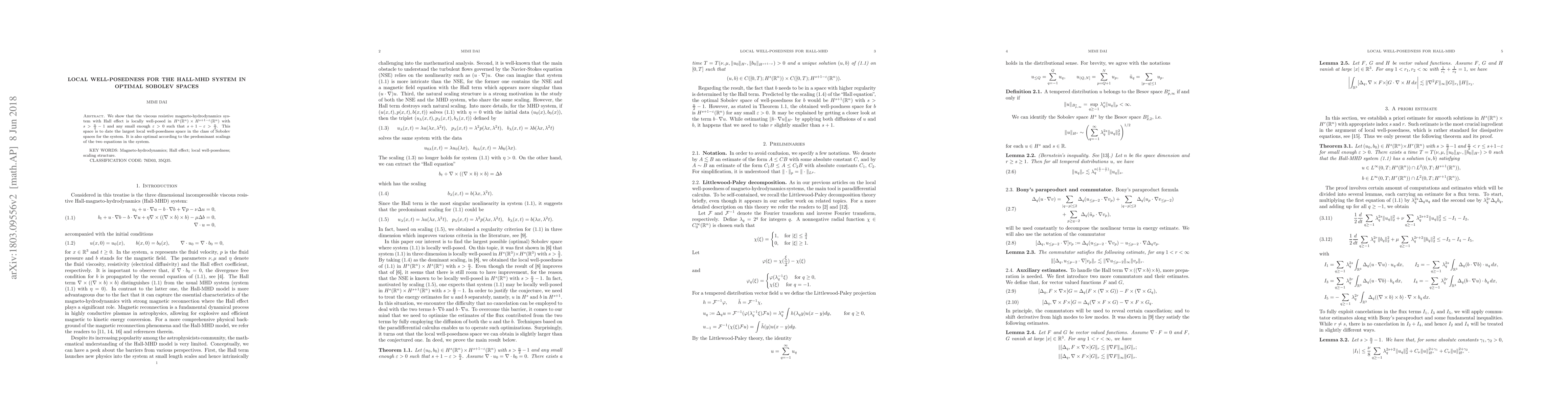 The paper establishes local well-posedness for the Hall-MHD system in the optimal Sobolev space $H^s(\mathbb R^n)\times H^{s+1-\varepsilon}(\mathbb R^n)$ for $s>\frac{n}{2}-1$ and small $\varepsilon>0$. This result represents the largest known local well-posedness space and is optimal based on the system's scaling properties.