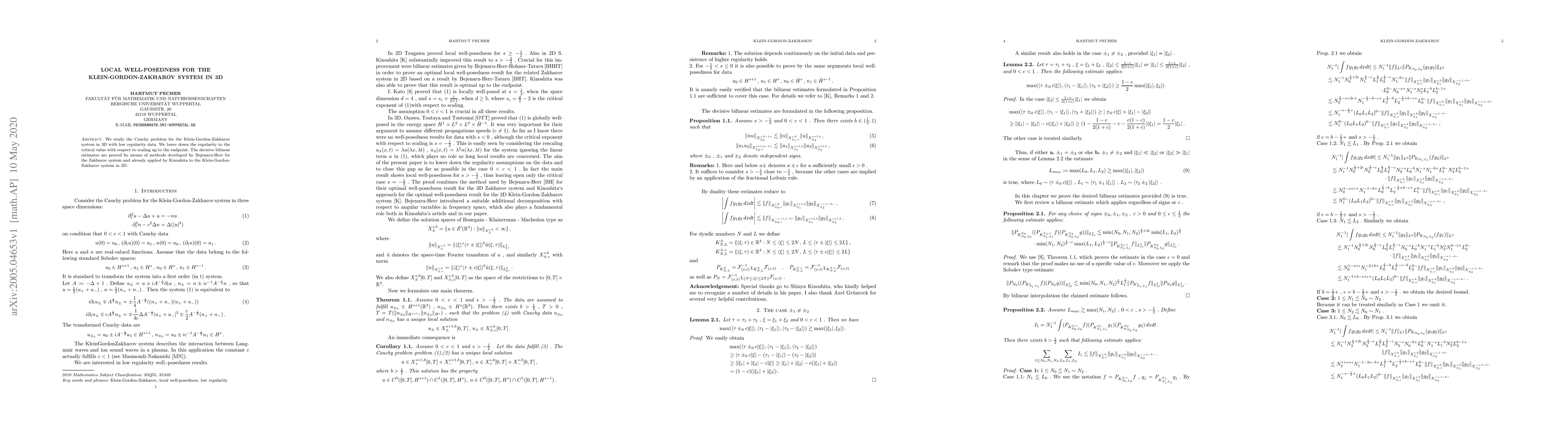 This paper investigates local well-posedness for the 3D Klein-Gordon-Zakharov system with minimal initial data regularity. It achieves the critical scaling regularity and utilizes bilinear estimates from Bejenaru-Herr and Kinoshita's methods to establish the results.