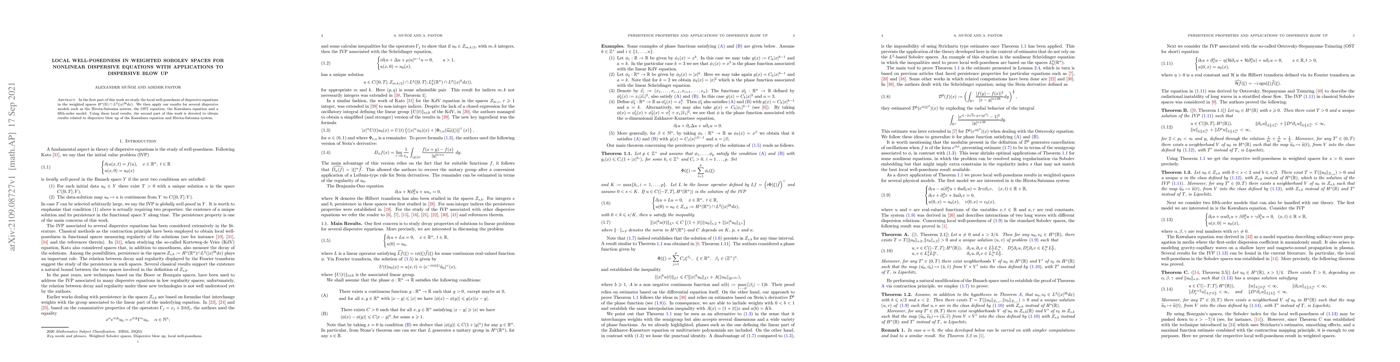 This paper investigates the local well-posedness of nonlinear dispersive equations in weighted Sobolev spaces and applies these findings to several dispersive models, including the Hirota-Satsuma system and the Kawahara equation. The study also explores dispersive blow-up phenomena for these models.
