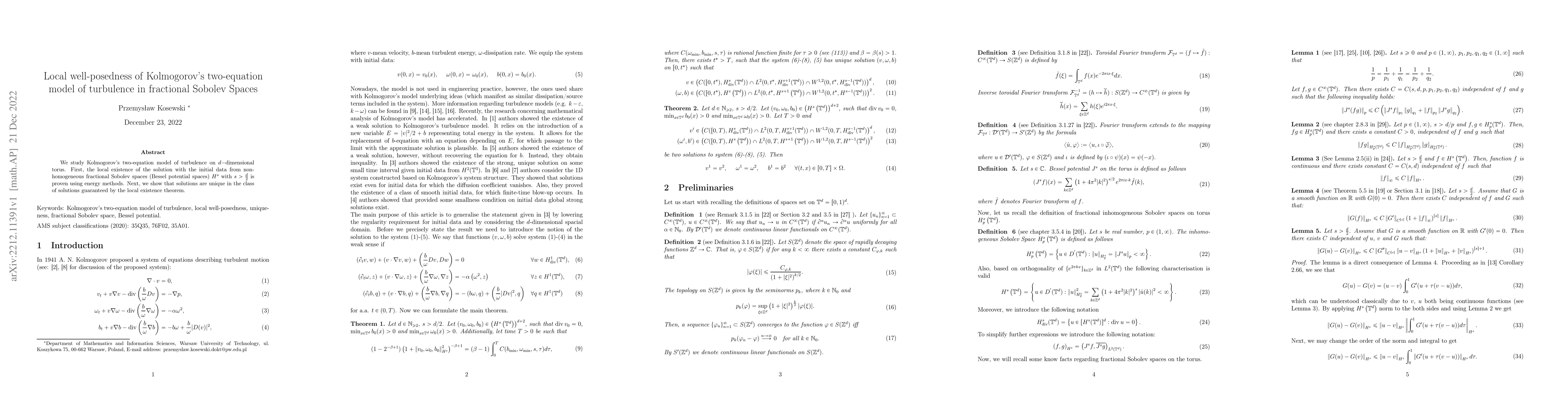 This paper proves local well-posedness for Kolmogorov's two-equation model of turbulence in fractional Sobolev spaces $H^s$ with $s > \frac{d}{2}$, establishing both existence and uniqueness of solutions using energy methods.