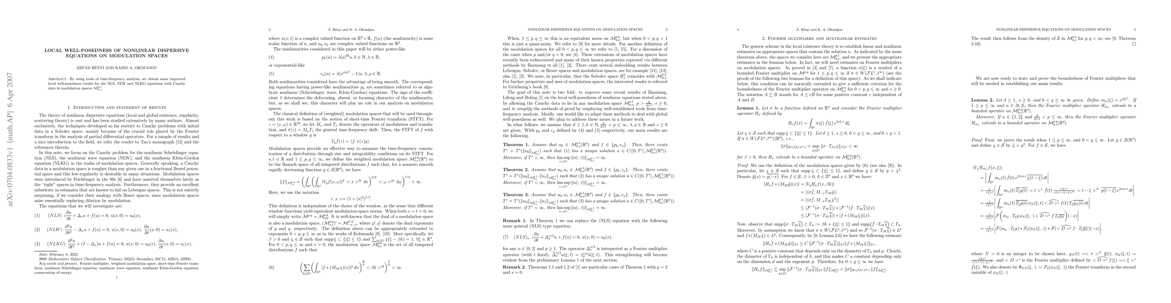 The paper establishes improved local well-posedness results for nonlinear dispersive equations—including NLS, NLW, and NLKG—by employing time-frequency analysis techniques, focusing on Cauchy data within modulation spaces $M{p, 1}_{0,s}$. These findings advance the understanding of the behavior of such equations in modulation spaces.