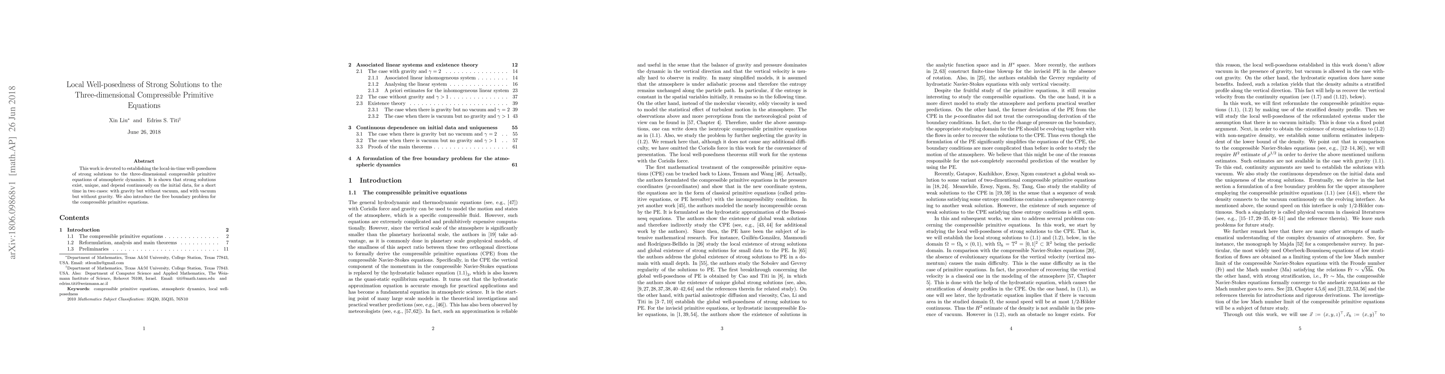 This paper establishes local well-posedness of strong solutions to the three-dimensional compressible primitive equations of atmospheric dynamics, proving their existence, uniqueness, and continuous dependence on initial data for short time in two scenarios: with gravity and without vacuum, and with vacuum but without gravity. It also introduces the free boundary problem for these equations.