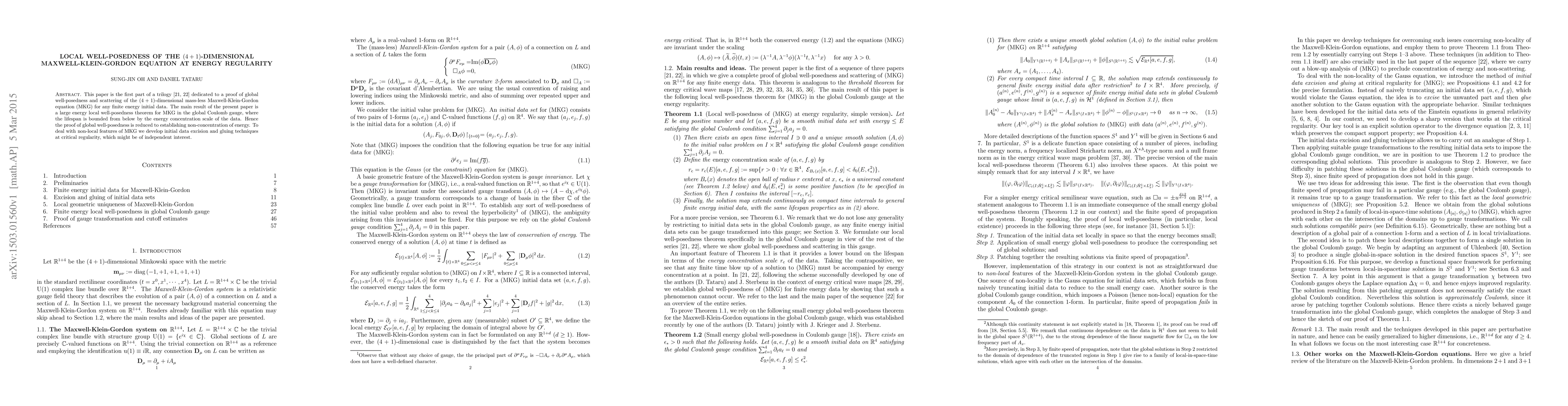 This paper is the first part of a trilogy dedicated to a proof of global well-posedness and scattering of the (4+1)-dimensional mass-less Maxwell-Klein-Gordon equation (MKG) for any finite energy initial data. The main result of the present paper is a large energy local well-posedness theorem for MKG in the global Coulomb gauge, where the lifespan is bounded from below by the energy concentration scale of the data. Hence the proof of global well-posedness is reduced to establishing non-concentration of energy. To deal with non-local features of MKG we develop initial data excision and gluing techniques at critical regularity, which might be of independent interest.