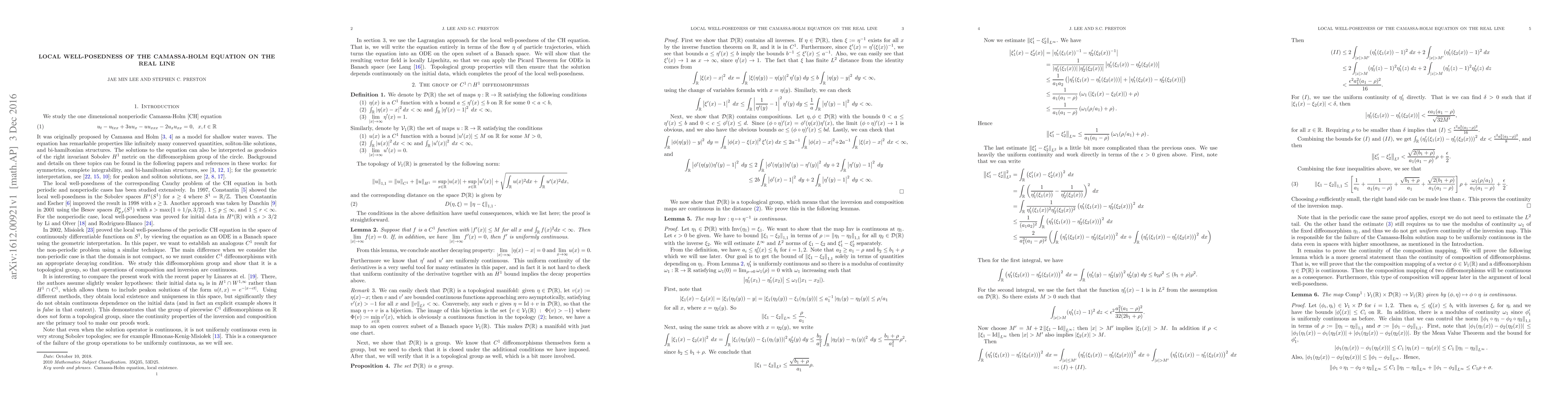 This paper establishes local well-posedness for the Camassa-Holm equation on the real line, using a Lagrangian approach to reformulate it as an ODE. It proves existence, uniqueness, and continuous dependence on initial data via diffeomorphism group properties.