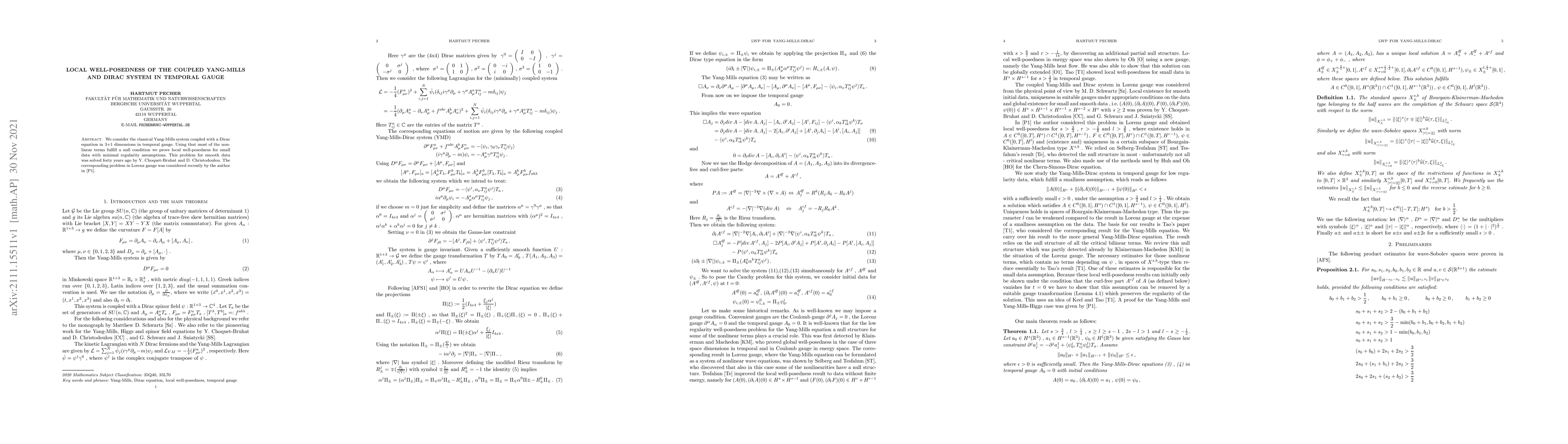 The paper establishes local well-posedness for the coupled Yang-Mills and Dirac system in 3+1 dimensions under the temporal gauge, leveraging null condition properties for nonlinear terms. This extends previous results for smooth data and differs from recent work in Lorenz gauge.