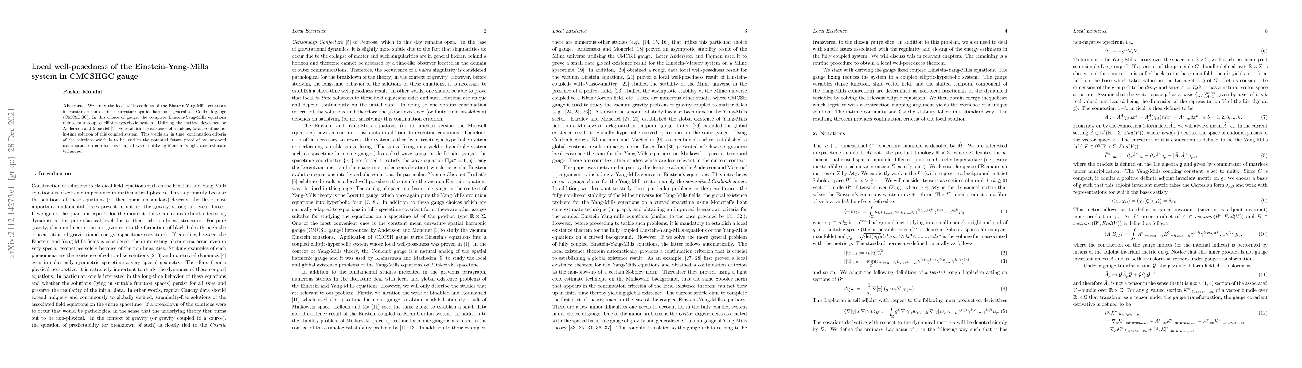 This paper investigates the local well-posedness of Einstein-Yang-Mills equations in CMCSHGC gauge, reducing them to a coupled elliptic-hyperbolic system. Using a method by Andersson and Moncrief, the authors prove the existence of a unique, local, continuous-in-time solution, and outline plans for future proofs using Moncrief's light cone estimate technique.