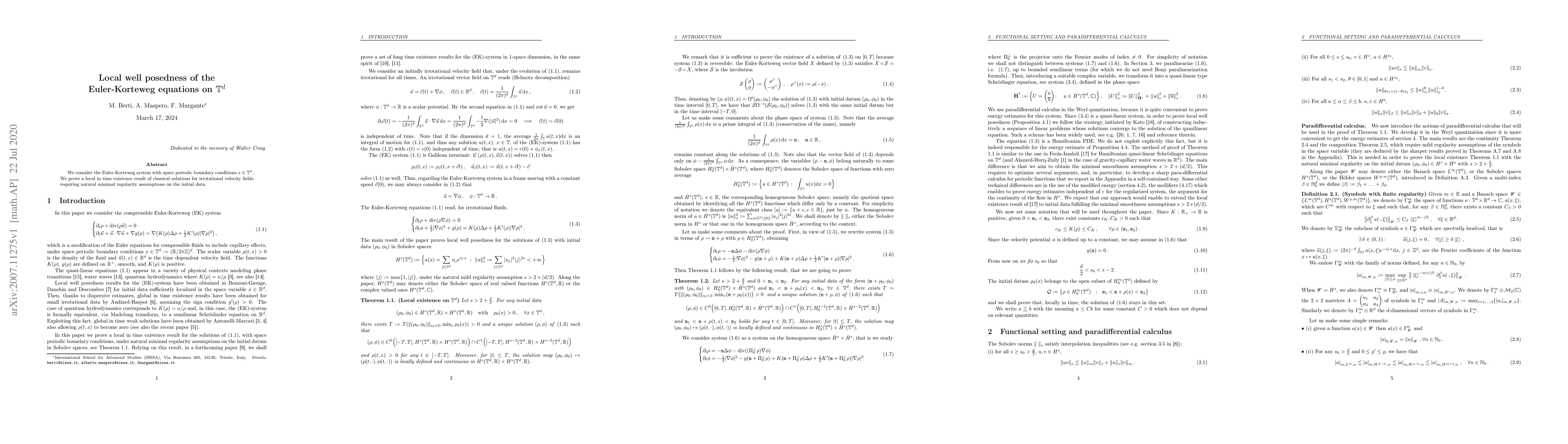 This paper proves local well-posedness in time for the Euler-Korteweg equations on torus $\mathbb T^d$ for irrotational velocity fields, establishing the existence of classical solutions under minimal regularity conditions on initial data.