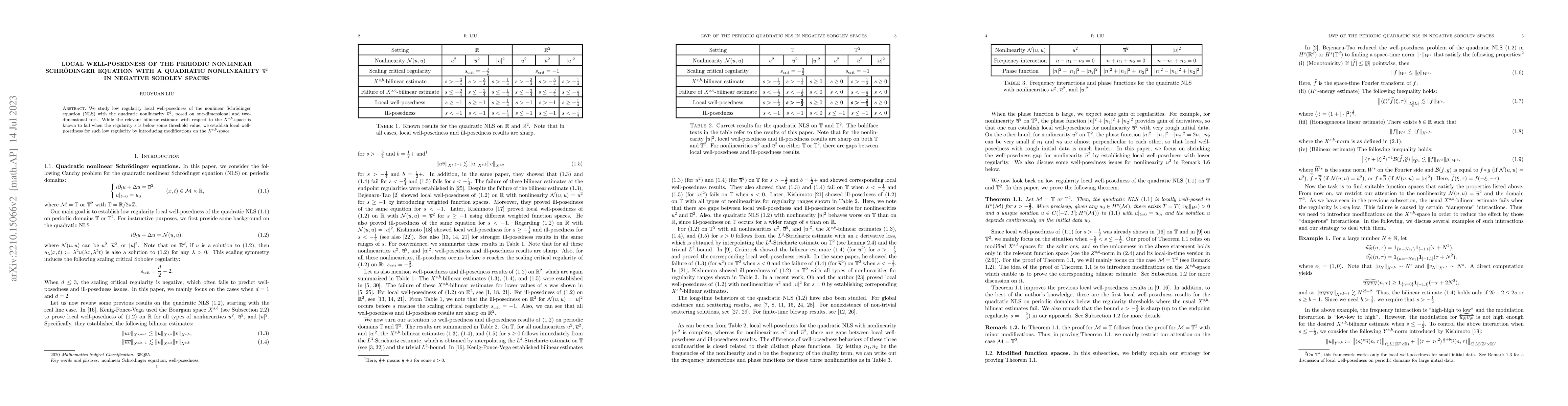 We study low regularity local well-posedness of the nonlinear Schr\"odinger equation (NLS) with the quadratic nonlinearity $\overline{u}^2$, posed on one-dimensional and two-dimensional tori. While the relevant bilinear estimate with respect to the $X^{s, b}$-space is known to fail when the regularity $s$ is below some threshold value, we establish local well-posedness for such low regularity by introducing modifications on the $X^{s, b}$-space.