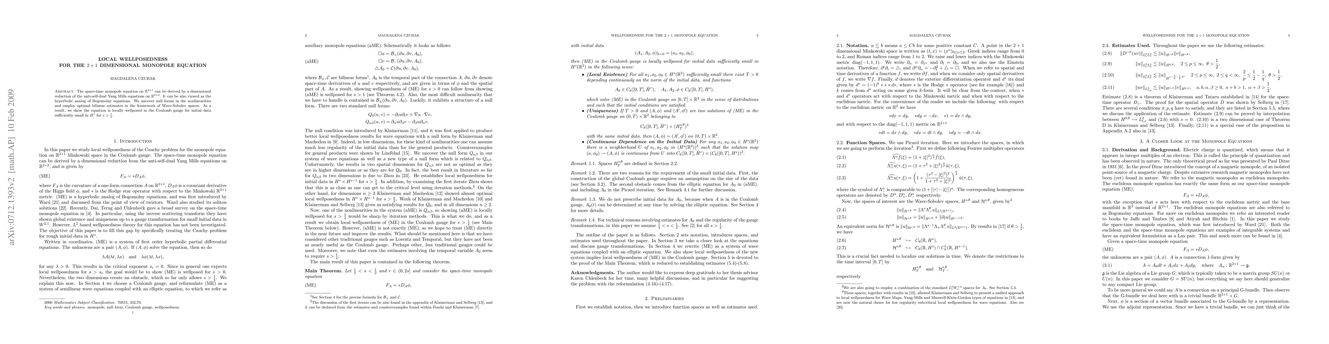 The space-time monopole equation on $\R^{2+1}$ can be derived by a dimensional reduction of the anti-self-dual Yang Mills equations on $\R^{2+2}$. It can be also viewed as the hyperbolic analog of Bogomolny equations. We uncover null forms in the nonlinearities and employ optimal bilinear estimates in the framework of Wave-Sobolev spaces. As a result, we show the equation is locally wellposed in the Coulomb gauge for initial data sufficiently small in $H^s$ for $s>{1/4}$.