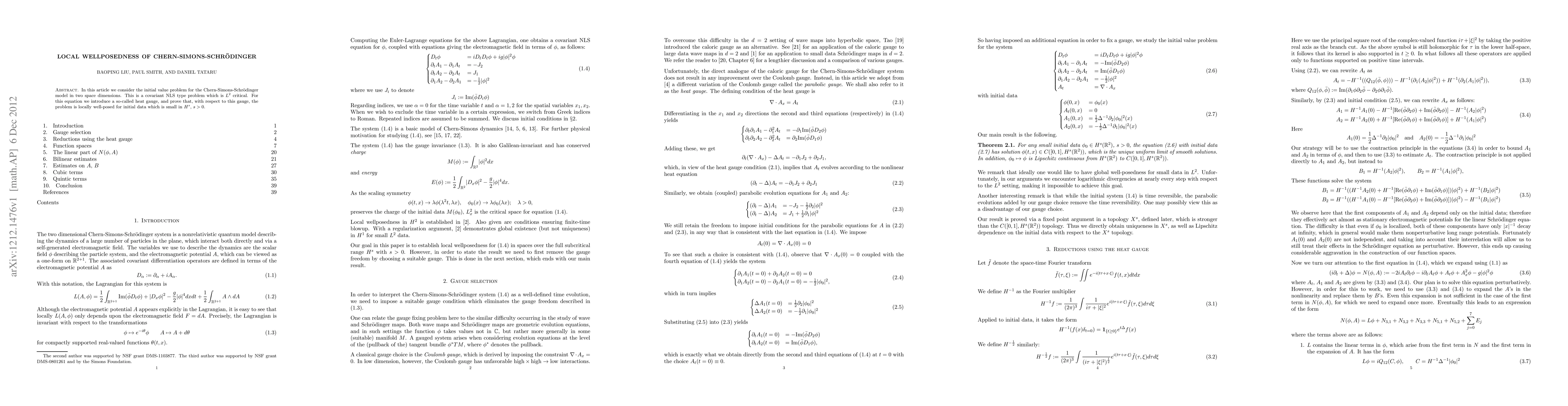 In this article we consider the initial value problem for the Chern-Simons-Schrodinger model in two space dimensions. This is a covariant NLS type problem which is L^2 critical. For this equation we introduce a so-called heat gauge, and prove that, with respect to this gauge, the problem is locally well-posed for initial data which is small in H^s, s > 0.