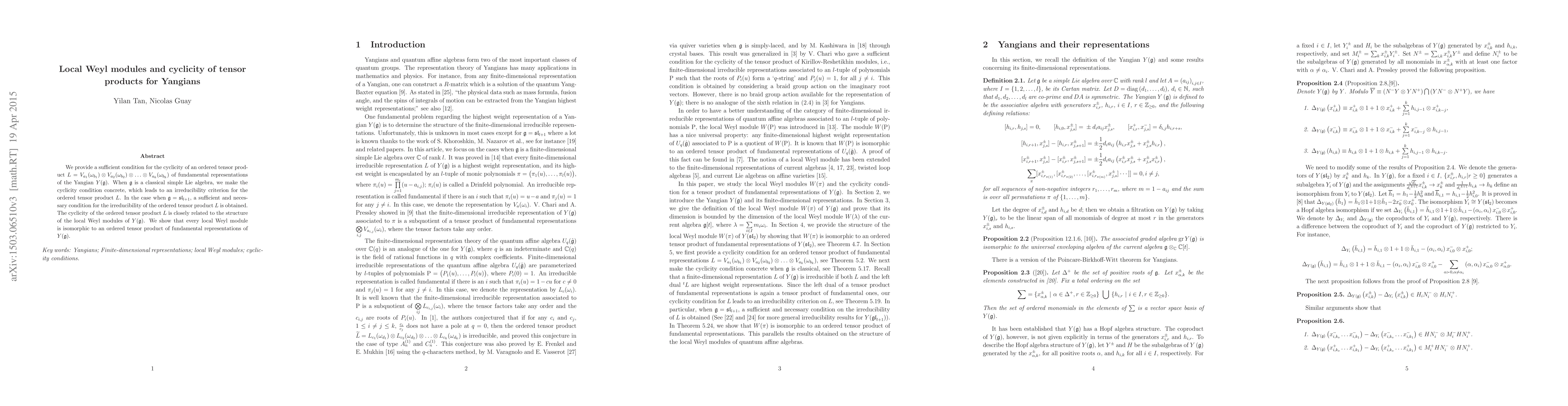 We provide a sufficient condition for the cyclicity of an ordered tensor product $L=V_{a_1}(\omega_{b_1})\otimes V_{a_2}(\omega_{b_2})\otimes...\otimes V_{a_k}(\omega_{b_k})$ of fundamental representations of the Yangian $Y(\mathfrak{g})$. When $\mathfrak{g}$ is a classical simple Lie algebra, we make the cyclicity condition concrete, which leads to an irreducibility criterion for the ordered tensor product $L$. In the case when $\mathfrak{g}=\mathfrak{sl}_{l+1}$, a sufficient and necessary condition for the irreducibility of the ordered tensor product $L$ is obtained. The cyclicity of the ordered tensor product $L$ is closely related to the structure of the local Weyl modules of $Y(\mathfrak{g})$. We show that every local Weyl module is isomorphic to an ordered tensor product of fundamental representations of $Y(\mathfrak{g})$.