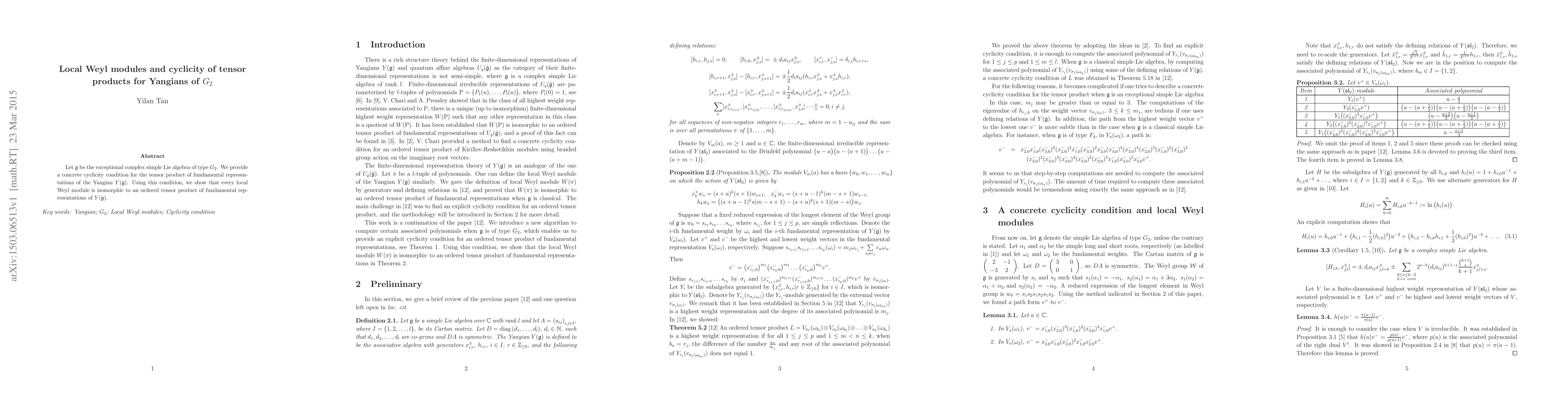 Researchers studied tensor products of Yangian $G_2$ representations, finding a cyclicity condition that reveals every local Weyl module can be expressed as an ordered product of fundamental representations.