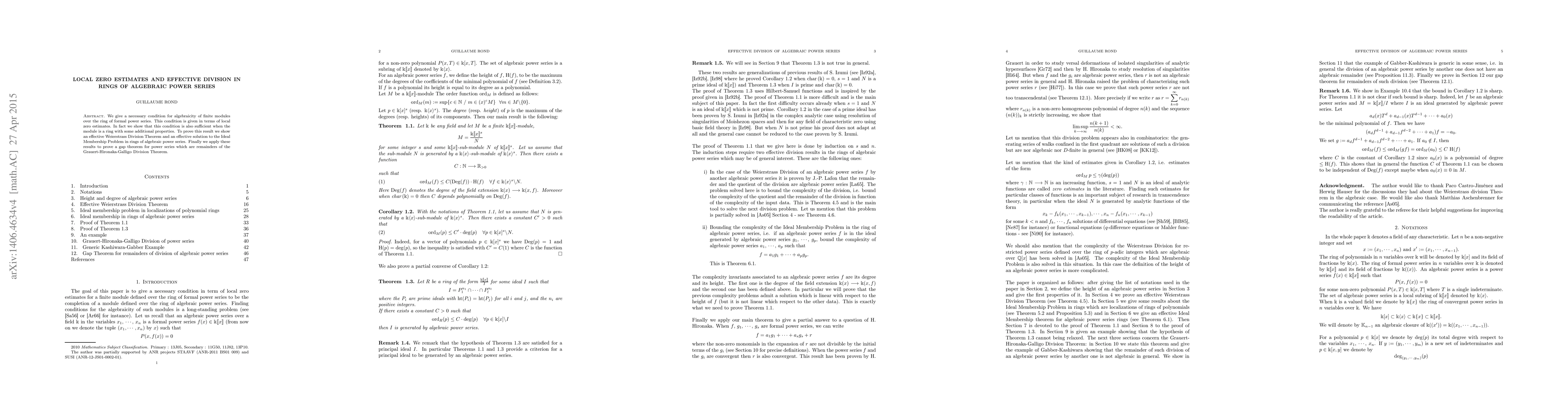 We give a necessary condition for algebraicity of finite modules over the ring of formal power series. This condition is given in terms of local zero estimates. In fact we show that this condition is also sufficient when the module is a ring with some additional properties. To prove this result we show an effective Weierstrass Division Theorem and an effective solution to the Ideal Membership Problem in rings of algebraic power series. Finally we apply these results to prove a gap theorem for power series which are remainders of the Grauert-Hironaka-Galligo Division Theorem.