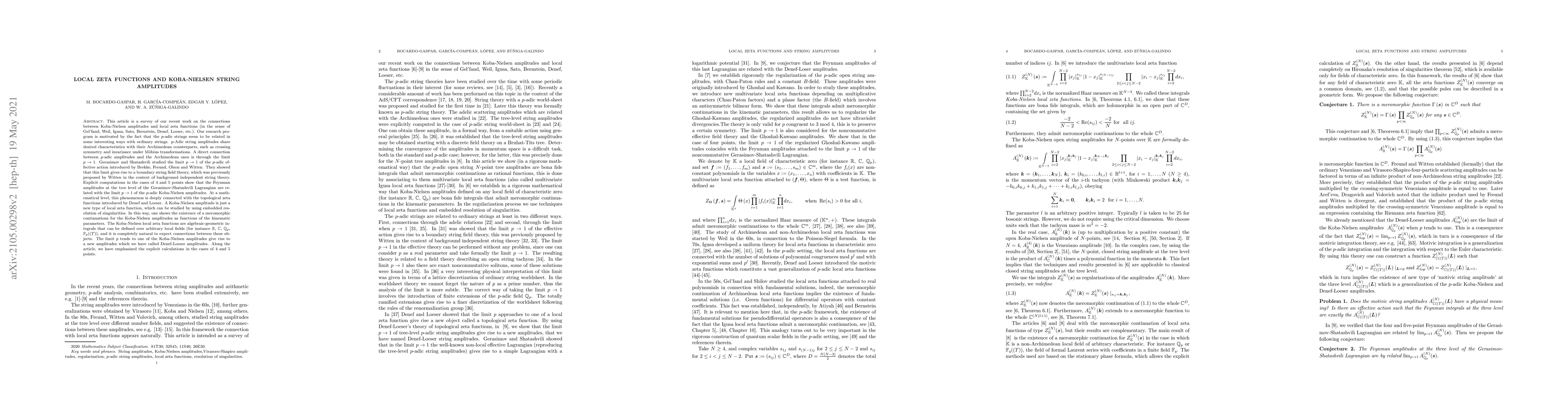 This paper surveys connections between Koba-Nielsen string amplitudes and local zeta functions, revealing a relationship through p-adic strings and their limit as p tends to 1, which aligns with boundary string field theory. Explicit calculations for 4 and 5 points show that these amplitudes relate to meromorphic continuations of Koba-Nielsen amplitudes, thus forming Denef-Loeser amplitudes.