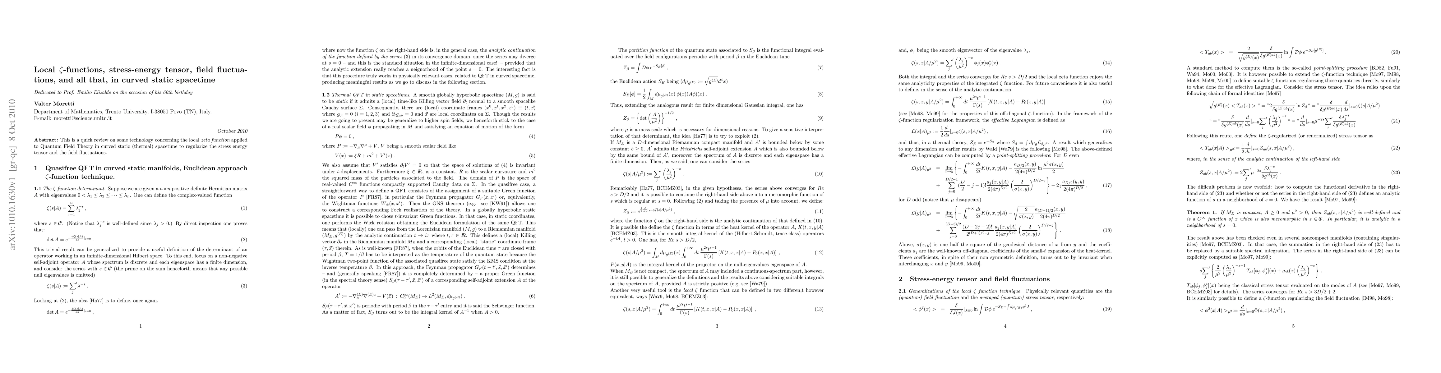 This is a quick review on some technology concerning the local zeta function applied to Quantum Field Theory in curved static (thermal) spacetime to regularize the stress-energy tensor and the field fluctuations.