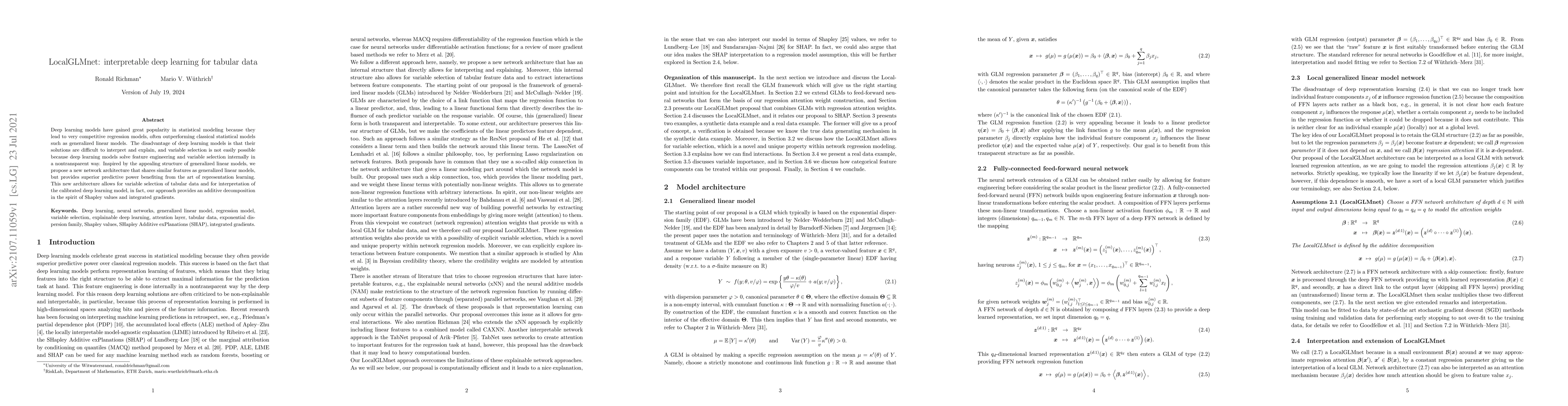 Deep learning models have gained great popularity in statistical modeling because they lead to very competitive regression models, often outperforming classical statistical models such as generalized linear models. The disadvantage of deep learning models is that their solutions are difficult to interpret and explain, and variable selection is not easily possible because deep learning models solve feature engineering and variable selection internally in a nontransparent way. Inspired by the appealing structure of generalized linear models, we propose a new network architecture that shares similar features as generalized linear models, but provides superior predictive power benefiting from the art of representation learning. This new architecture allows for variable selection of tabular data and for interpretation of the calibrated deep learning model, in fact, our approach provides an additive decomposition in the spirit of Shapley values and integrated gradients.