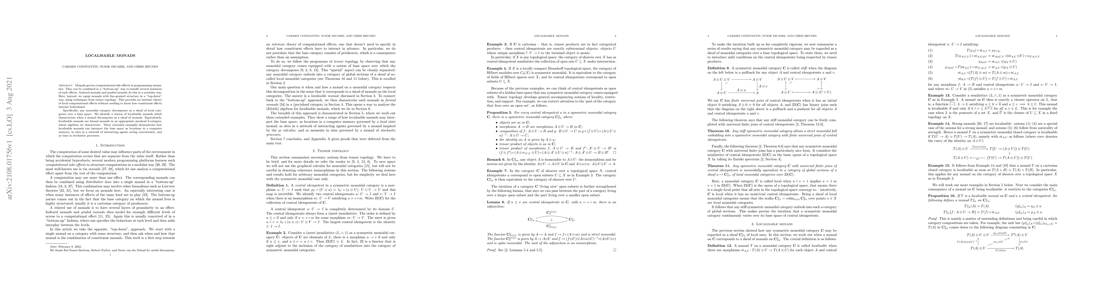 Monads govern computational side-effects in programming semantics. They can be combined in a ''bottom-up'' way to handle several instances of such effects. Indexed monads and graded monads do this in a modular way. Here, instead, we equip monads with fine-grained structure in a ''top-down'' way, using techniques from tensor topology. This provides an intrinsic theory of local computational effects without needing to know how constituent effects interact beforehand. Specifically, any monoidal category decomposes as a sheaf of local categories over a base space. We identify a notion of localisable monads which characterises when a monad decomposes as a sheaf of monads. Equivalently, localisable monads are formal monads in an appropriate presheaf 2-category, whose algebras we characterise. Three extended examples demonstrate how localisable monads can interpret the base space as locations in a computer memory, as sites in a network of interacting agents acting concurrently, and as time in stochastic processes.