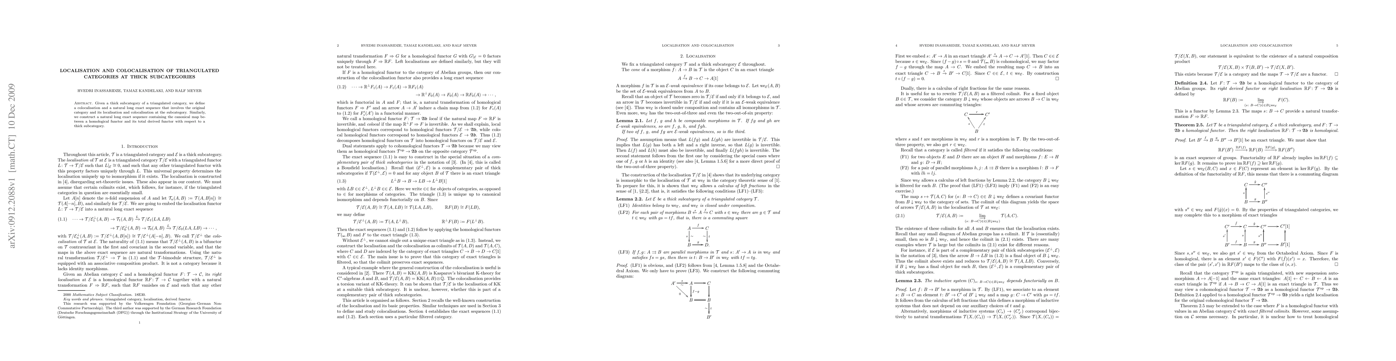 Summary: This paper introduces the concepts of localisation and colocalisation of triangulated categories concerning thick subcategories, and constructs associated natural long exact sequences that connect these categories and their transformations.