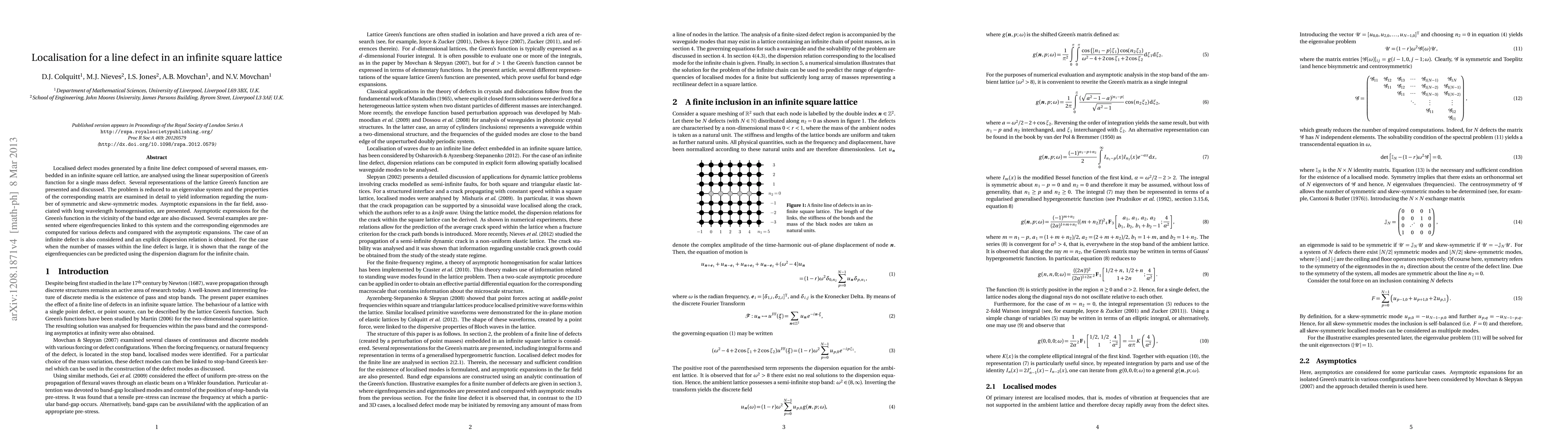 Localised defect modes generated by a finite line defect composed of several masses, embedded an infinite square cell lattice, are analysed using the linear superposition of Green's function for a single mass defect. Several representations of the lattice Green's function are presented and discussed. The problem is reduced to an eigenvalue system and the properties of the corresponding matrix are examined in detail to yield information regarding the number of symmetric and skew-symmetric modes. Asymptotic expansions in the far field, associated with long wavelength homogenisation are presented. Asymptotic expressions for Green's function in the vicinity of the band edge are also discussed. Several examples are presented where eigenfrequencies linked to this system and the corresponding eigenmodes are computed for various defects and compared with the asymptotic expansions. The case of an infinite defect is also considered and an explicit dispersion relation is obtained. For the case when the number of masses within the line defect is large, it is shown that the range of the eigenfrequencies can be predicted using the dispersion diagram for the infinite chain.