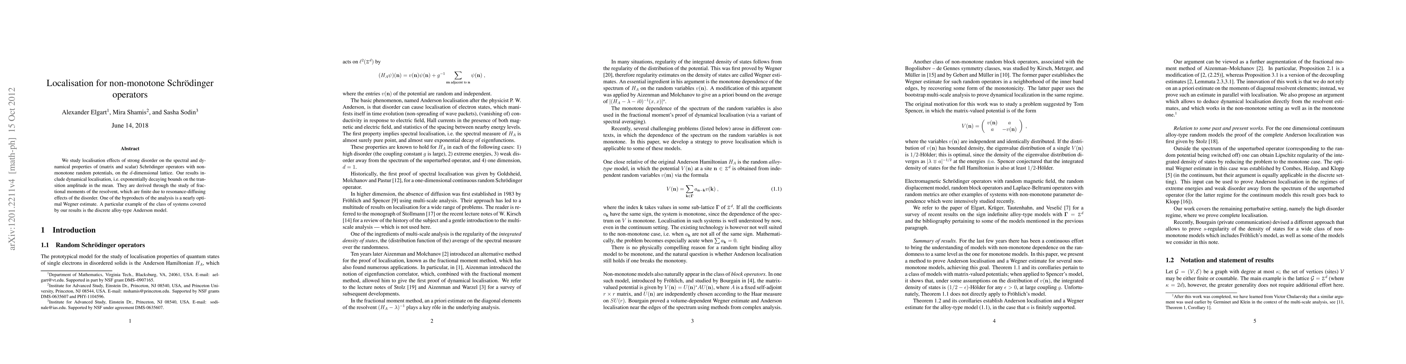We study localisation effects of strong disorder on the spectral and dynamical properties of (matrix and scalar) Schroedinger operators with non-monotone random potentials, on the d-dimensional lattice. Our results include dynamical localisation, i.e. exponentially decaying bounds on the transition amplitude in the mean. They are derived through the study of fractional moments of the resolvent, which are finite due to resonance-diffusing effects of the disorder. One of the byproducts of the analysis is a nearly optimal Wegner estimate. A particular example of the class of systems covered by our results is the discrete alloy-type Anderson model.
