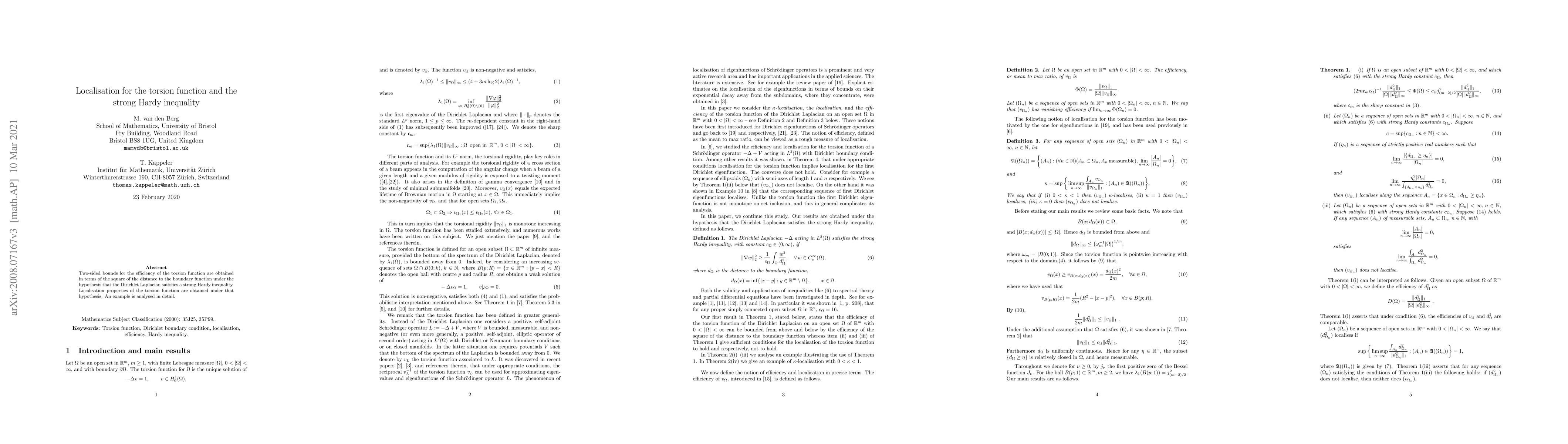 Two-sided bounds for the efficiency of the torsion function are obtained in terms of the square of the distance to the boundary function under the hypothesis that the Dirichlet Laplacian satisfies a strong Hardy inequality. Localisation properties of the torsion function are obtained under that hypothesis. An example is analysed in detail.