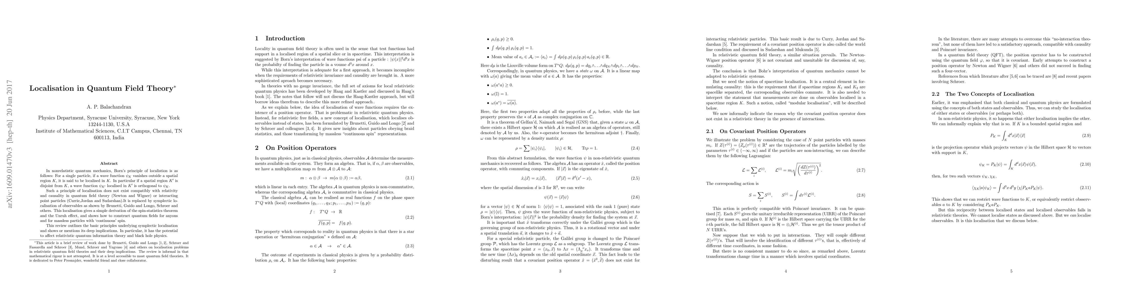 In nonrelatistic quantum mechanics, Born's principle of localistion is as follows: For a single particle, if a wave function $\psi_K$ vanishes outside a spatial region $K$, it is said to be localised in $K$. In particular if a spatial region $K'$ is disjoint from $K$, a wave function $\psi_{K'}$ localised in $K'$ is orthogonal to $\psi_K$. Such a principle of localisation does not exist compatibly with relativity and causality in quantum field theory (Newton and Wigner) or interacting point particles (Currie,Jordan and Sudarshan).It is replaced by symplectic localisation of observables as shown by Brunetti, Guido and Longo, Schroer and others. This localisation gives a simple derivation of the spin-statistics theorem and the Unruh effect, and shows how to construct quantum fields for anyons and for massless particles with `continuous' spin. This review outlines the basic principles underlying symplectic localisation and shows or mentions its deep implications. In particular, it has the potential to affect relativistic quantum information theory and black hole physics.