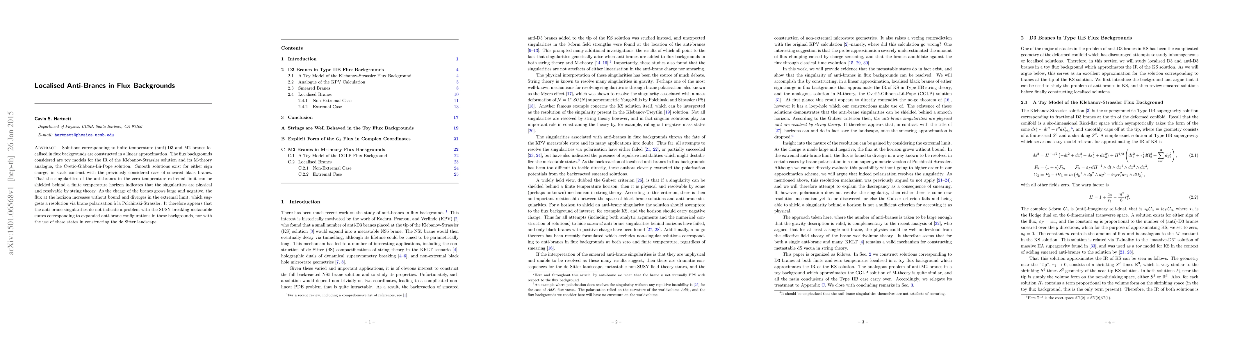 This research constructs localised anti-brane solutions in flux backgrounds, revealing smooth solutions even at finite temperature and suggesting that anti-brane singularities are physical and resolvable. The study concludes that large negative charge on anti-branes may lead to resolution through brane polarisation, implying no issue with SUSY-breaking metastable states or the de Sitter landscape construction.