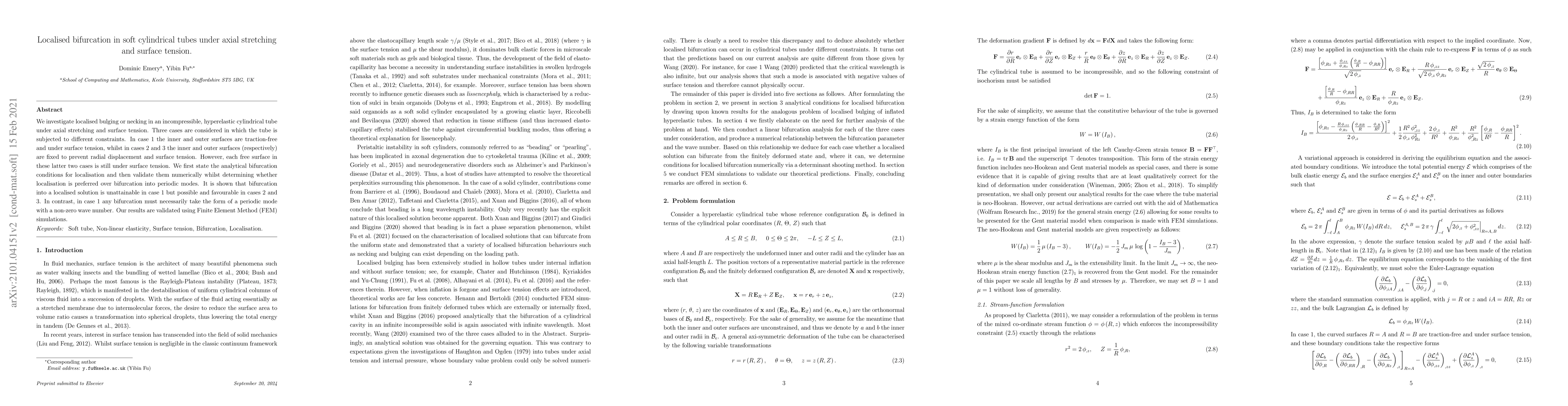 We investigate localised bulging or necking in an incompressible, hyperelastic cylindrical tube under axial stretching and surface tension. Three cases are considered in which the tube is subjected to different constraints. In case 1 the inner and outer surfaces are traction-free and under surface tension, whilst in cases 2 and 3 the inner and outer surfaces (respectively) are fixed to prevent radial displacement and surface tension. However, each free surface in these latter two cases is still under surface tension. We first state the analytical bifurcation conditions for localisation and then validate them numerically whilst determining whether localisation is preferred over bifurcation into periodic modes. It is shown that bifurcation into a localised solution is unattainable in case 1 but possible and favourable in cases 2 and 3. In contrast, in case 1 any bifurcation must necessarily take the form of a periodic mode with a non-zero wave number. Our results are validated using Finite Element Method (FEM) simulations.
