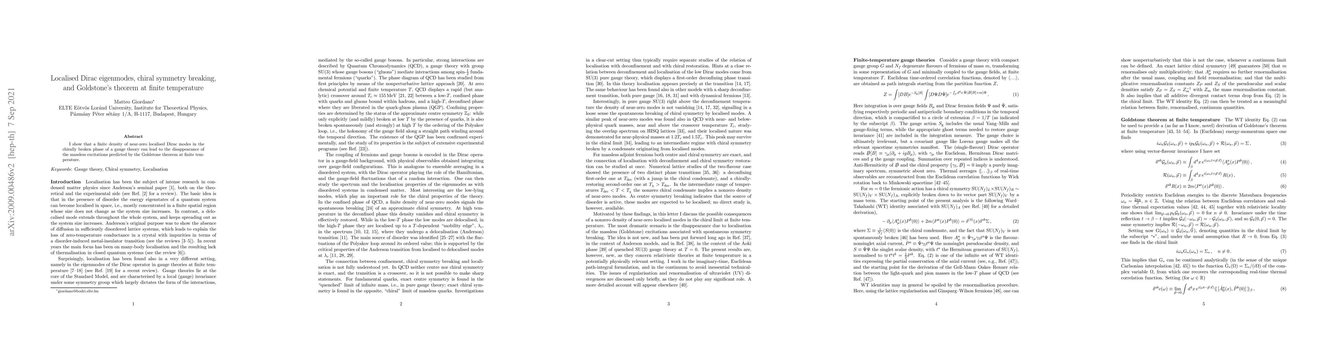 Researchers found that a finite density of near-zero localised Dirac modes can disappear massless excitations predicted by Goldstone's theorem at finite temperature in gauge theories.