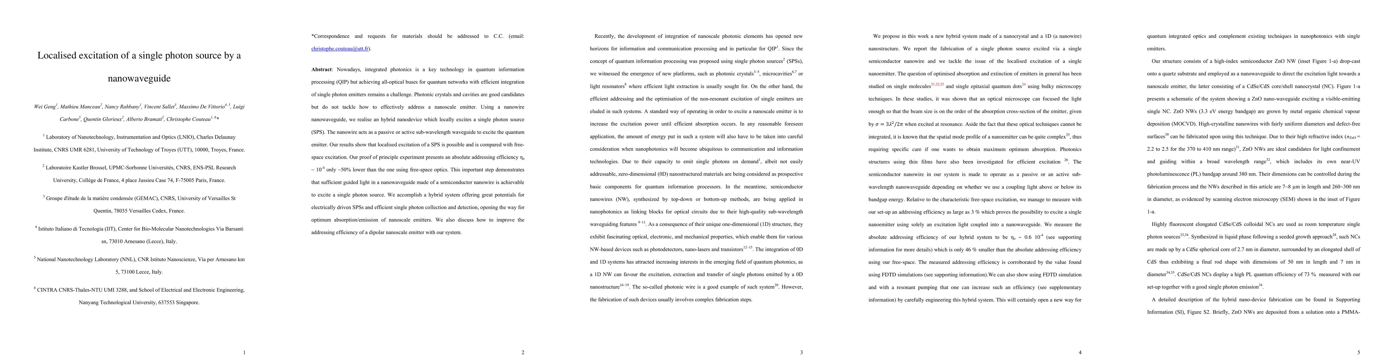 Nowadays, integrated photonics is a key technology in quantum information processing (QIP) but achieving all-optical buses for quantum networks with efficient integration of single photon emitters remains a challenge. Photonic crystals and cavities are good candidates but do not tackle how to effectively address a nanoscale emitter. Using a nanowire nanowaveguide, we realise an hybrid nanodevice which locally excites a single photon source (SPS). The nanowire acts as a passive or active sub-wavelength waveguide to excite the quantum emitter. Our results show that localised excitation of a SPS is possible and is compared with free-space excitation. Our proof of principle experiment presents an absolute addressing efficiency {\eta}a = 10-4 only 50% lower than the one using free-space optics. This important step demonstrates that sufficient guided light in a nanowaveguide made of a semiconductor nanowire is achievable to excite a single photon source. We accomplish a hybrid system offering great potentials for electrically driven SPSs and efficient single photon collection and detection, opening the way for optimum absorption/emission of nanoscale emitters. We also discuss how to improve the addressing efficiency of a dipolar nanoscale emitter with our system.