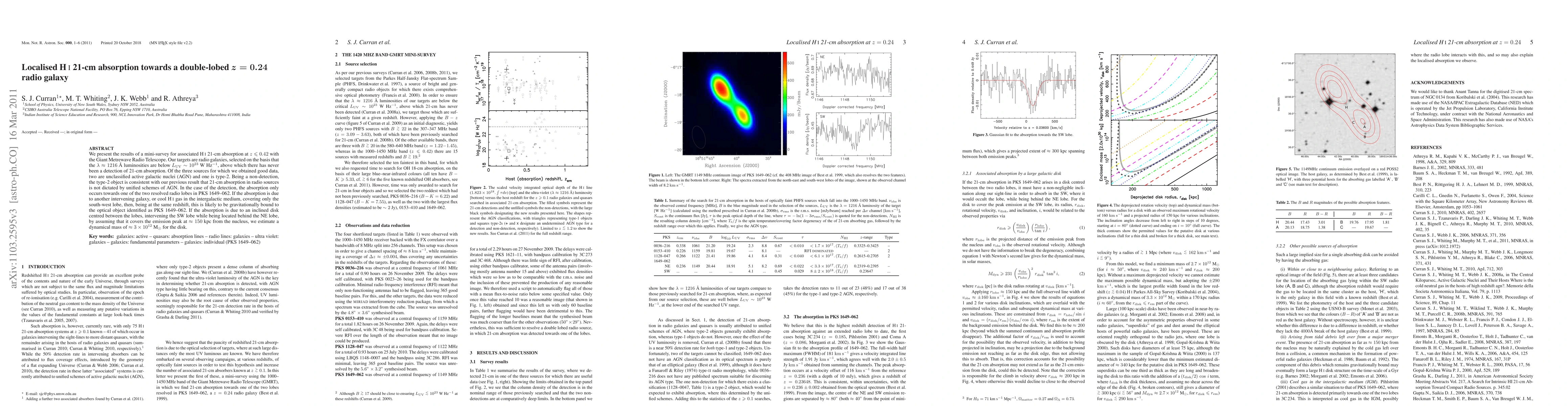 A radio galaxy was found to have 21-cm absorption only in one of its lobes, suggesting a gravitationally bound disk or cool gas cloud at the same redshift as the galaxy.