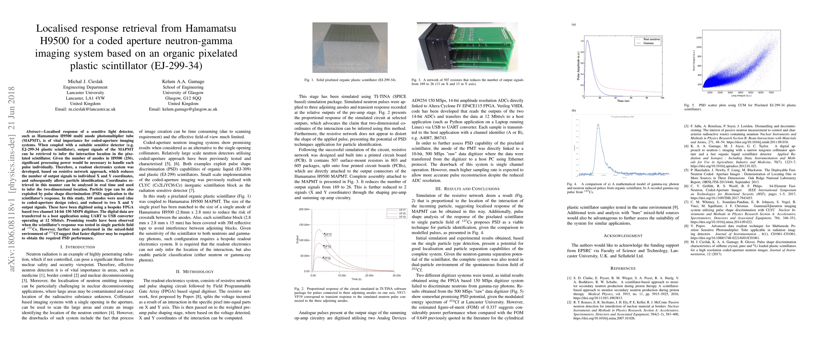Localised response of a sensitive light detector, such as Hamamatsu H9500 multi anode photomultiplier tube (MAPMT), is of vital importance for coded-aperture imaging systems. When coupled with a suitable sensitive detector (e.g. EJ-299-34 plastic scintillator), output signals of the MAPMT can be retrieved to infer the interaction location in the pixelated scintillator. Given the number of anodes in H9500 (256), significant processing power would be necessary to handle each pulse individually. Therefore, a readout electronics system was developed, based on resistive network approach, which reduces the number of output signals to individual X and Y coordinates, and subsequently allows particle identification. Coordinates retrieved in this manner can be analysed in real time and used to infer the two-dimensional location. Particle type can be also exploited by pulse shape discrimination (PSD) application to the scintillator response. In this study, 169 anodes were used (due to coded-aperture design rules), and reduced to two X and Y output signals. These have been digitised using a bespoke FPGA based two channel 14-bit 150 MSPS digitiser. The digital data are transferred to a host application using UART to USB converter operating at 12 Mbits/s. Promising results have been observed when the scintillator's response was tested in single particle field of Cs-137. However, further tests performed in the mixed-field environment of Cf-252 suggest that faster digitiser may be required to obtain the required PSD performance.