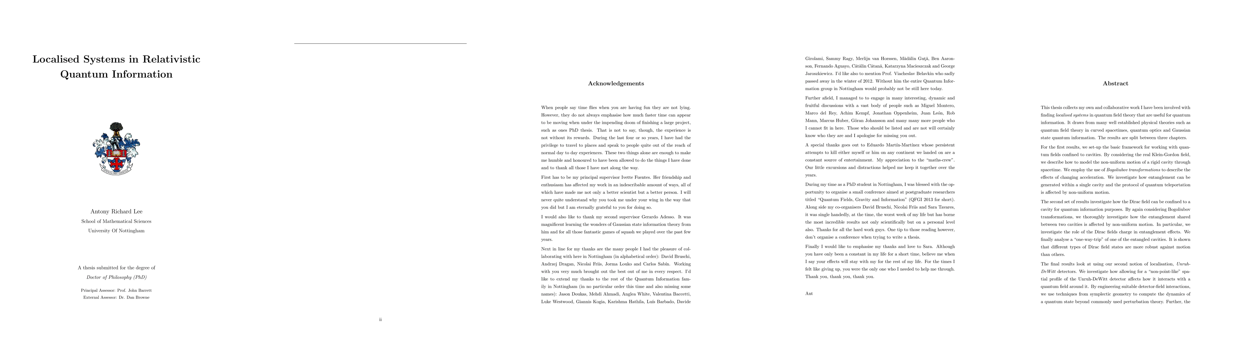 This thesis explores localised systems in relativistic quantum information, focusing on quantum fields confined to cavities and Unruh-DeWitt detectors. It employs Bogoliubov transformations to study the effects of non-uniform motion on quantum entanglement and field interactions, revealing different robustness levels among Dirac field states.