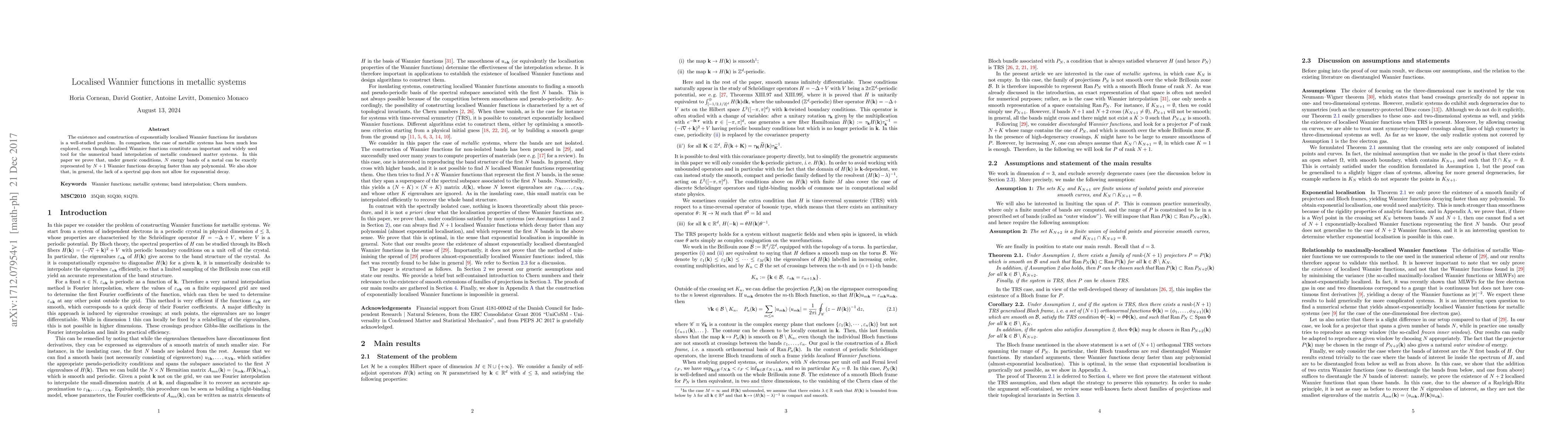 This paper proves that metallic systems can be represented by $N+1$ exponentially localised Wannier functions for $N$ energy bands under generic conditions, although the absence of a spectral gap prevents exponential decay.