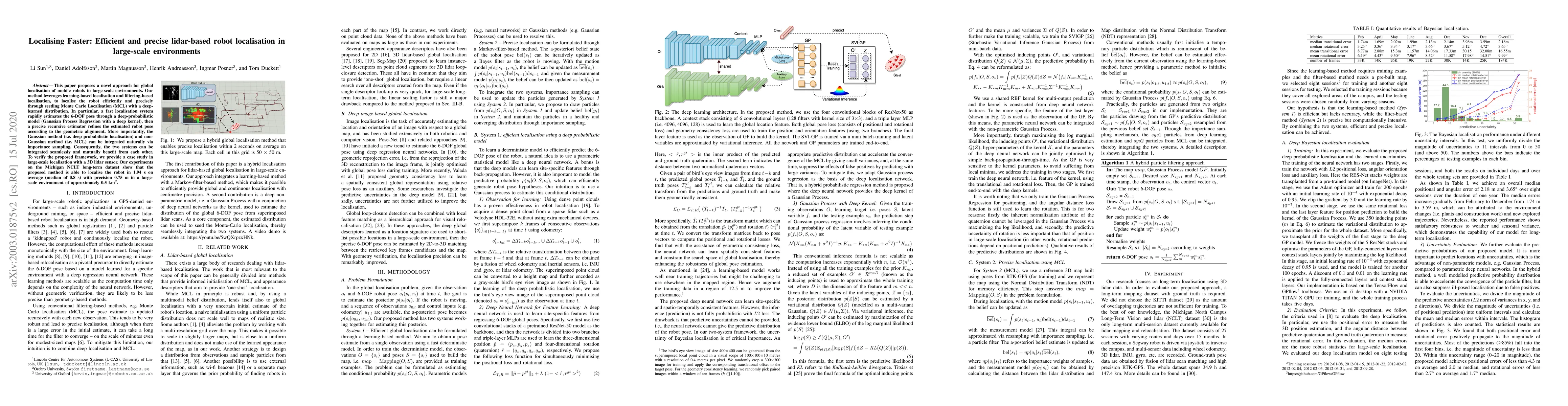 This paper proposes a hybrid approach combining deep learning and Monte Carlo Localisation for efficient and precise robot localisation in large-scale environments, achieving an average localisation time of 1.94 seconds and a precision of 0.75 meters. The method integrates Gaussian and non-Gaussian techniques seamlessly for optimal performance.