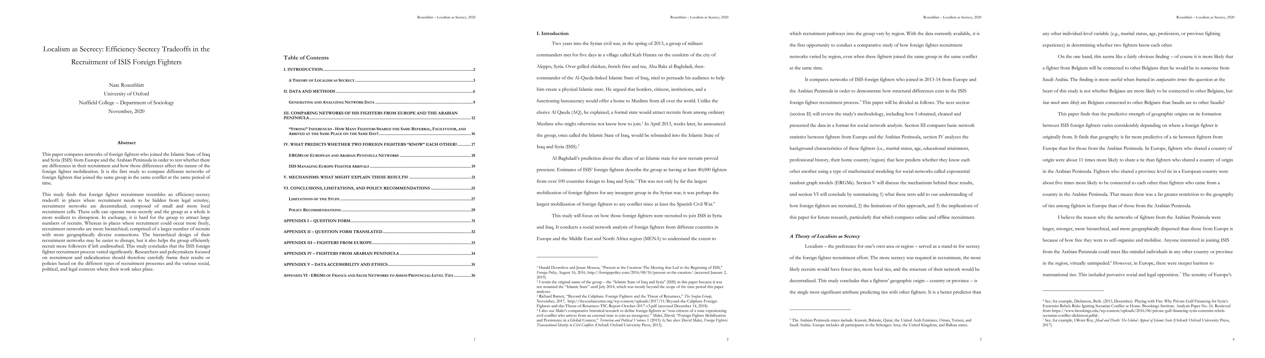 This paper compares networks of foreign fighters who joined the Islamic State of Iraq and Syria (ISIS) from Europe and the Arabian Peninsula in order to test whether there are differences in their recruitment and how those differences affect the nature of the foreign fighter mobilization. It is the first study to compare different networks of foreign fighters that joined the same group in the same conflict at the same period of time. This study finds that foreign fighter recruitment resembles an efficiency-secrecy tradeoff: in places where recruitment needs to be hidden from legal scrutiny, recruitment networks are decentralized; composed of small and more local recruitment cells. These cells can operate more secretly and the group as a whole is more resilient to disruption. In exchange, it is hard for the group to attract large numbers of recruits. Whereas in places where recruitment could occur more freely, recruitment networks are more hierarchical; comprised of a larger number of recruits with more geographically diverse connections. The hierarchical design of their recruitment networks may be easier to disrupt, but it also helps the group efficiently recruit more followers if left undisturbed. This study concludes that the ISIS foreign fighter recruitment process varied significantly. Researchers and policymakers focused on recruitment and radicalization should therefore carefully frame their results or policies based on the different types of recruitment processes and the various social, political, and legal contexts where their work takes place.