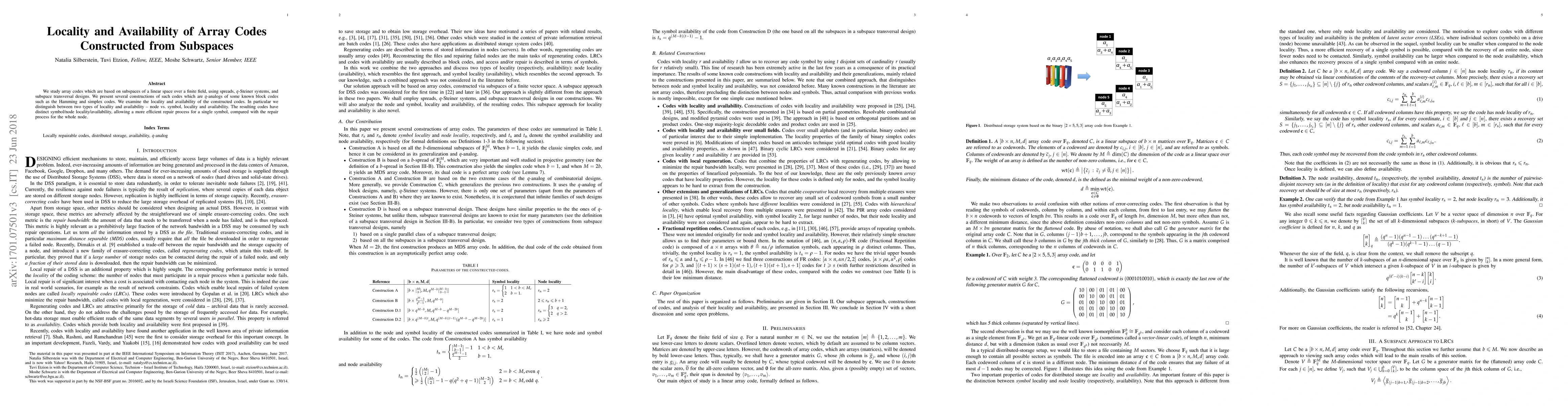 Ever-increasing amounts of data are created and processed in internet-scale companies such as Google, Facebook, and Amazon. The efficient storage of such copious amounts of data has thus become a fundamental and acute problem in modern computing. No single machine can possibly satisfy such immense storage demands. Therefore, distributed storage systems (DSS), which rely on tens of thousands of storage nodes, are the only viable solution. Such systems are broadly used in all modern internet-scale systems. However, the design of a DSS poses a number of crucial challenges, markedly different from single-user storage systems. Such systems must be able to reconstruct the data efficiently, to overcome failure of servers, to correct errors, etc. Lots of research was done in the last few years to answer these challenges and the research is increasing in parallel to the increasing amount of stored data. The main goal of this paper is to consider codes which have two of the most important features of distributed storage systems, namely, locality and availability. Our codes are array codes which are based on subspaces of a linear space over a finite field. We present several constructions of such codes which are $q$-analog to some of the known block codes. Some of these codes possess independent intellectual merit. We examine the locality and availability of the constructed codes. In particular we distinguish between two types of locality and availability, node vs.~symbol, locality and availability. To our knowledge this is the first time that such a distinction is given in the literature.