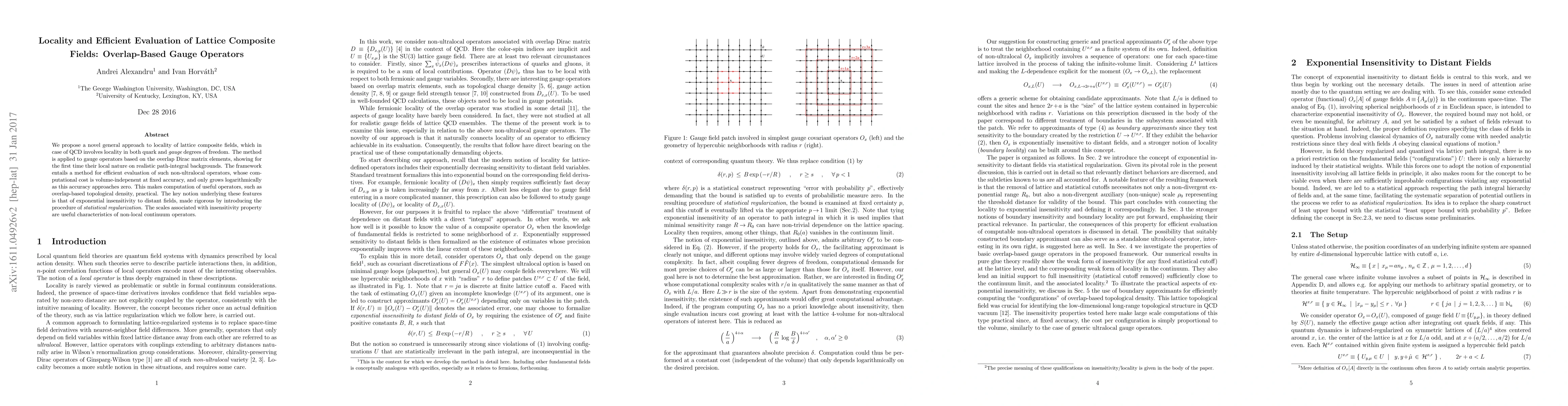 We propose a novel general approach to locality of lattice composite fields, which in case of QCD involves locality in both quark and gauge degrees of freedom. The method is applied to gauge operators based on the overlap Dirac matrix elements, showing for the first time their local nature on realistic path-integral backgrounds. The framework entails a method for efficient evaluation of such non-ultralocal operators, whose computational cost is volume-indepenent at fixed accuracy, and only grows logarithmically as this accuracy approaches zero. This makes computation of useful operators, such as overlap-based topological density, practical. The key notion underlying these features is that of exponential insensitivity to distant fields, made rigorous by introducing the procedure of statistical regularization. The scales associated with insensitivity property are useful characteristics of non-local continuum operators.