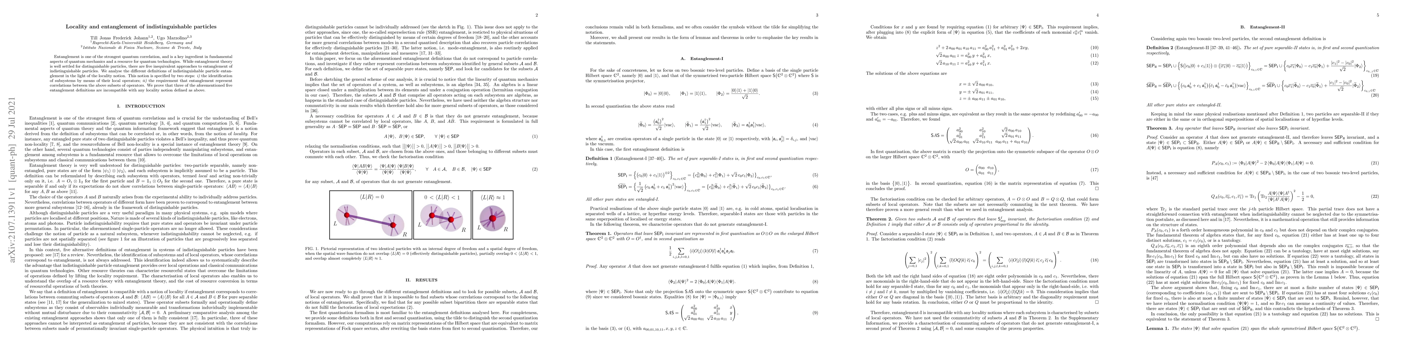 This paper examines various definitions of entanglement for indistinguishable particles in relation to the concept of locality. It reveals that three out of five entanglement definitions are incompatible with the proposed locality criteria based on local operators and inter-subsystem correlations.