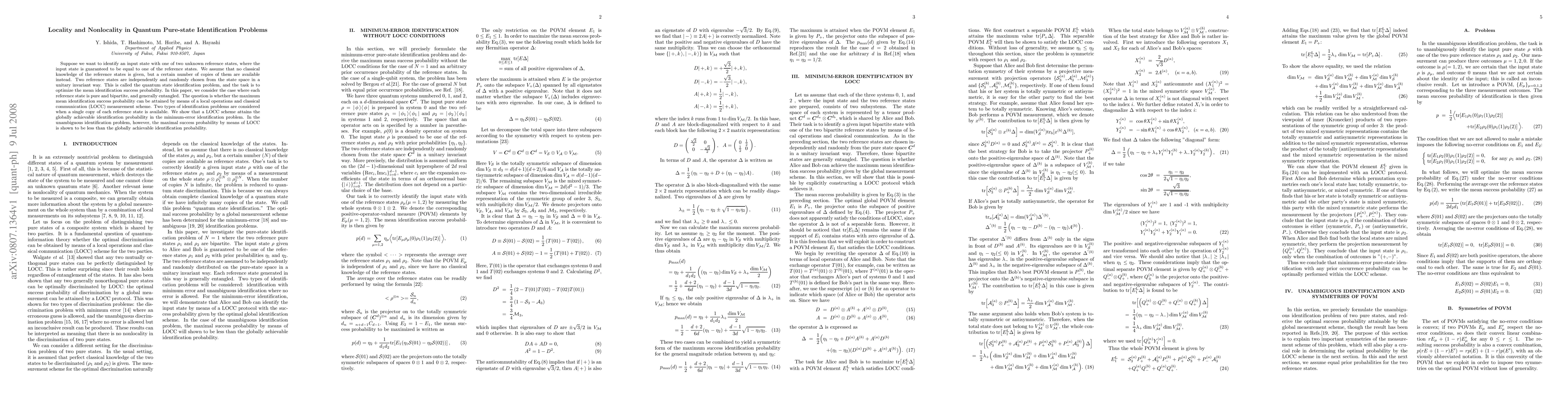 Researchers investigated the feasibility of identifying a pure state with two unknown reference states using local operations and classical communication. They found that in one type of identification problem, LOCC can achieve the globally achievable probability, but not in another.
