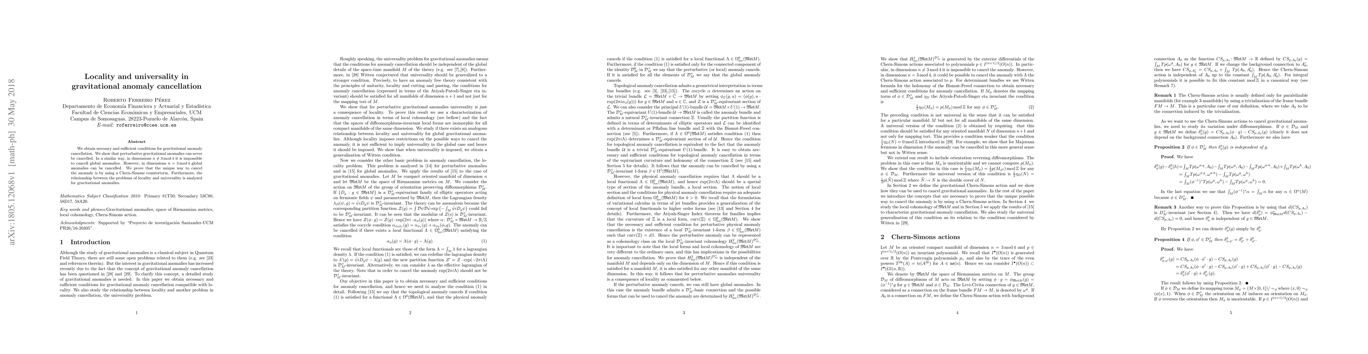 We obtain necesary and sufficient conditions for gravitational anomaly cancellation. We show that perturbative gravitational anomalies can never be cancelled. In a similar way, in dimensions $n\neq3\operatorname{mod}4$ it is impossible to cancell global anomalies. However, in dimensions $n=3\operatorname{mod}4$ global anomalies can be cancelled. We prove that the unique way to cancel the anomaly is by using a Chern-Simons counterterm. Furthermore, the relationship between the problems of locality and universality is analyzed for gravitational anomalies.