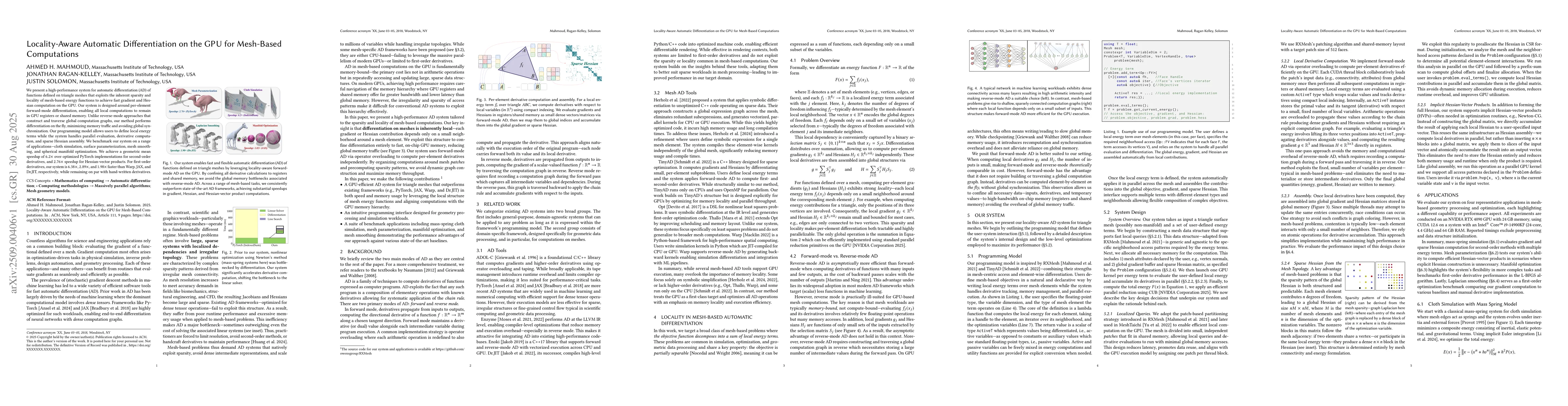 We present a high-performance system for automatic differentiation (AD) of functions defined on triangle meshes that exploits the inherent sparsity and locality of mesh-based energy functions to achieve fast gradient and Hessian computation on the GPU. Our system is designed around per-element forward-mode differentiation, enabling all local computations to remain in GPU registers or shared memory. Unlike reverse-mode approaches that construct and traverse global computation graphs, our method performs differentiation on the fly, minimizing memory traffic and avoiding global synchronization. Our programming model allows users to define local energy terms while the system handles parallel evaluation, derivative computation, and sparse Hessian assembly. We benchmark our system on a range of applications--cloth simulation, surface parameterization, mesh smoothing, and spherical manifold optimization. We achieve a geometric mean speedup of 6.2x over optimized PyTorch implementations for second-order derivatives, and 2.76x speedup for Hessian-vector products. For first-order derivatives, our system is 6.38x, 2.89x, and 1.98x faster than Warp, JAX, and Dr.JIT, respectively, while remaining on par with hand-written derivatives.