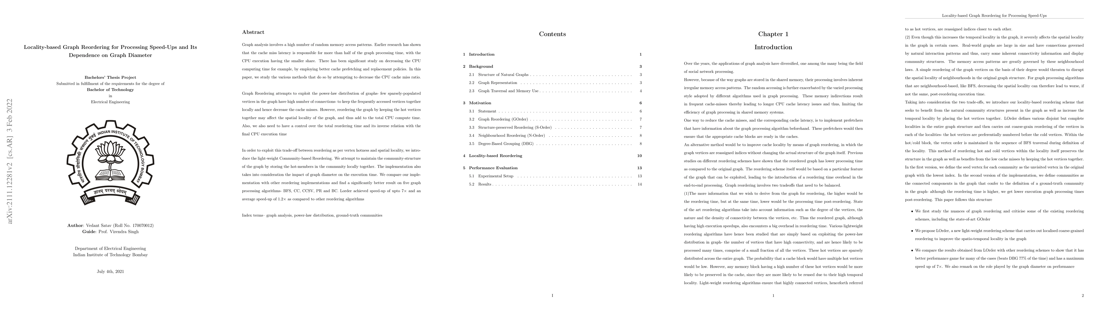 Graph analysis involves a high number of random memory access patterns. Earlier research has shownthat the cache miss latency is responsible for more than half of the graph processing time, with the CPU execution having the smaller share. There has been significant study on decreasing the CPU computing time for example, by employing better cache prefetching and replacement policies. In thispaper, we study the various methods that do so by attempting to decrease the CPU cache miss ratio.Graph Reordering attempts to exploit the power-law distribution of graphs -- few sparsely-populated vertices in the graph have high number of connections -- to keep the frequently accessed vertices together locally and hence decrease the cache misses. However, reordering the graph by keeping the hot vertices together may affect the spatial locality of the graph, and thus add to the total CPU compute time.Also, we also need to have a control over the total reordering time and its inverse relation with thefinal CPU execution timeIn order to exploit this trade-off between reordering as per vertex hotness and spatial locality, we introduce the light-weight Community-based Reordering. We attempt to maintain the community-structureof the graph by storing the hot-members in the community locally together. The implementation also takes into consideration the impact of graph diameter on the execution time. We compare our implementation with other reordering implementations and find a significantly better result on five graph processing algorithms: BFS, CC, CCSV, PR and BC. Lorder achieved speed-up of upto 7x and an average speed-up of 1.2x as compared to other reordering algorithms