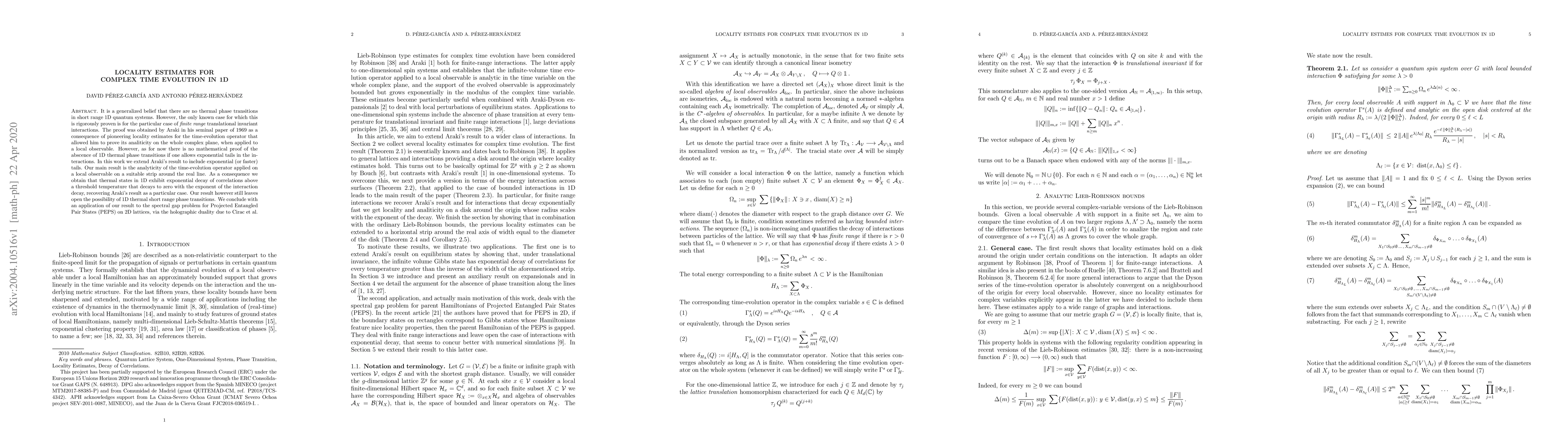 It is a generalized belief that there are no thermal phase transitions in short range 1D quantum systems. However, the only known case for which this is rigorously proven is for the particular case of finite range translational invariant interactions. The proof was obtained by Araki in his seminal paper of 1969 as a consequence of pioneering locality estimates for the time-evolution operator that allowed him to prove its analiticity on the whole complex plane, when applied to a local observable. However, as for now there is no mathematical proof of the abscence of 1D thermal phase transitions if one allows exponential tails in the interactions. In this work we extend Araki's result to include exponential (or faster) tails. Our main result is the analyticity of the time-evolution operator applied on a local observable on a suitable strip around the real line. As a consequence we obtain that thermal states in 1D exhibit exponential decay of correlations above a threshold temperature that decays to zero with the exponent of the interaction decay, recovering Araki's result as a particular case. Our result however still leaves open the possibility of 1D thermal short range phase transitions. We conclude with an application of our result to the spectral gap problem for Projected Entangled Pair States (PEPS) on 2D lattices, via the holographic duality due to Cirac et al.