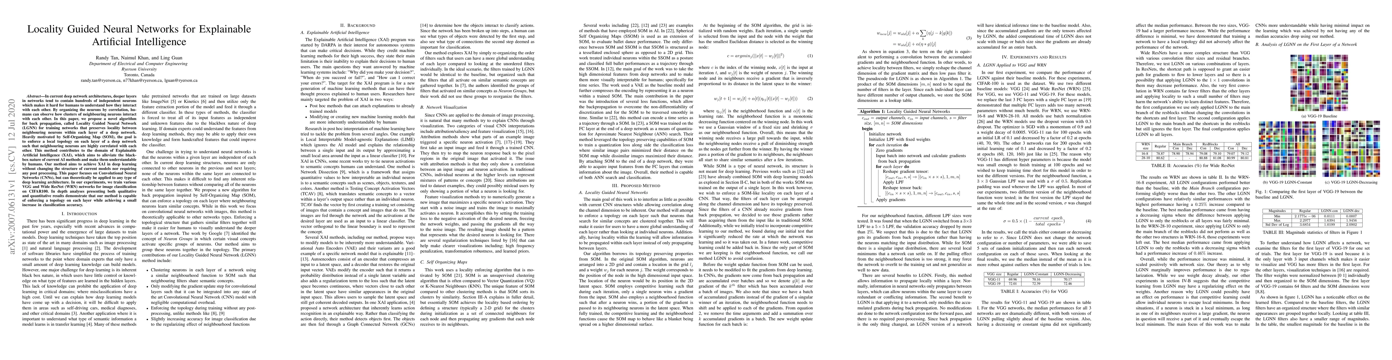 In current deep network architectures, deeper layers in networks tend to contain hundreds of independent neurons which makes it hard for humans to understand how they interact with each other. By organizing the neurons by correlation, humans can observe how clusters of neighbouring neurons interact with each other. In this paper, we propose a novel algorithm for back propagation, called Locality Guided Neural Network(LGNN) for training networks that preserves locality between neighbouring neurons within each layer of a deep network. Heavily motivated by Self-Organizing Map (SOM), the goal is to enforce a local topology on each layer of a deep network such that neighbouring neurons are highly correlated with each other. This method contributes to the domain of Explainable Artificial Intelligence (XAI), which aims to alleviate the black-box nature of current AI methods and make them understandable by humans. Our method aims to achieve XAI in deep learning without changing the structure of current models nor requiring any post processing. This paper focuses on Convolutional Neural Networks (CNNs), but can theoretically be applied to any type of deep learning architecture. In our experiments, we train various VGG and Wide ResNet (WRN) networks for image classification on CIFAR100. In depth analyses presenting both qualitative and quantitative results demonstrate that our method is capable of enforcing a topology on each layer while achieving a small increase in classification accuracy
