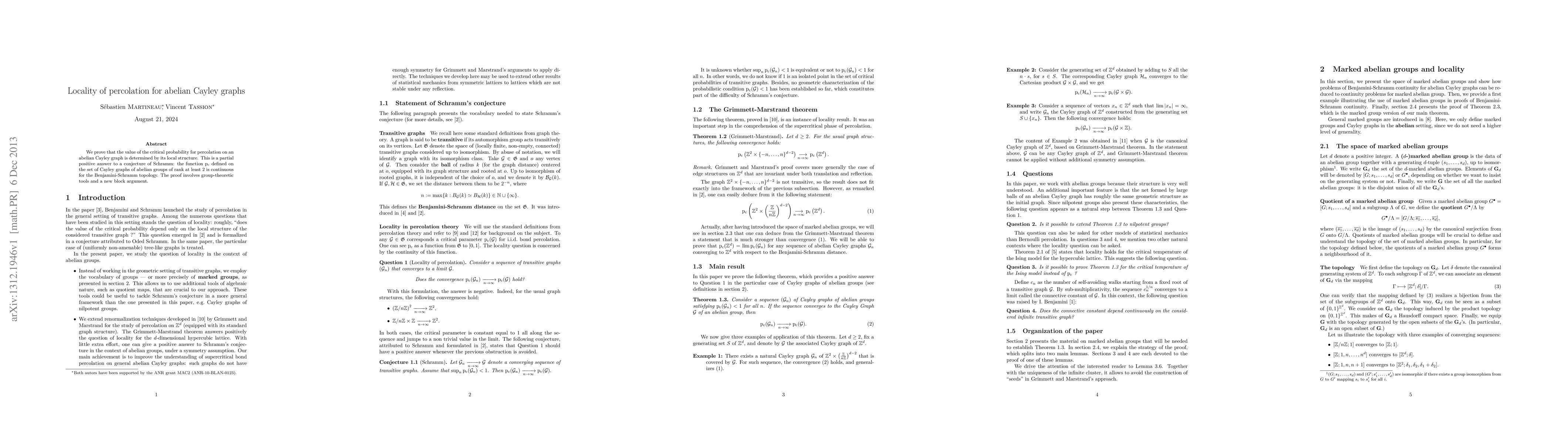 The paper proves that percolation on abelian Cayley graphs has a critical probability determined by its local structure, answering a conjecture of Schramm about the continuity of this function.