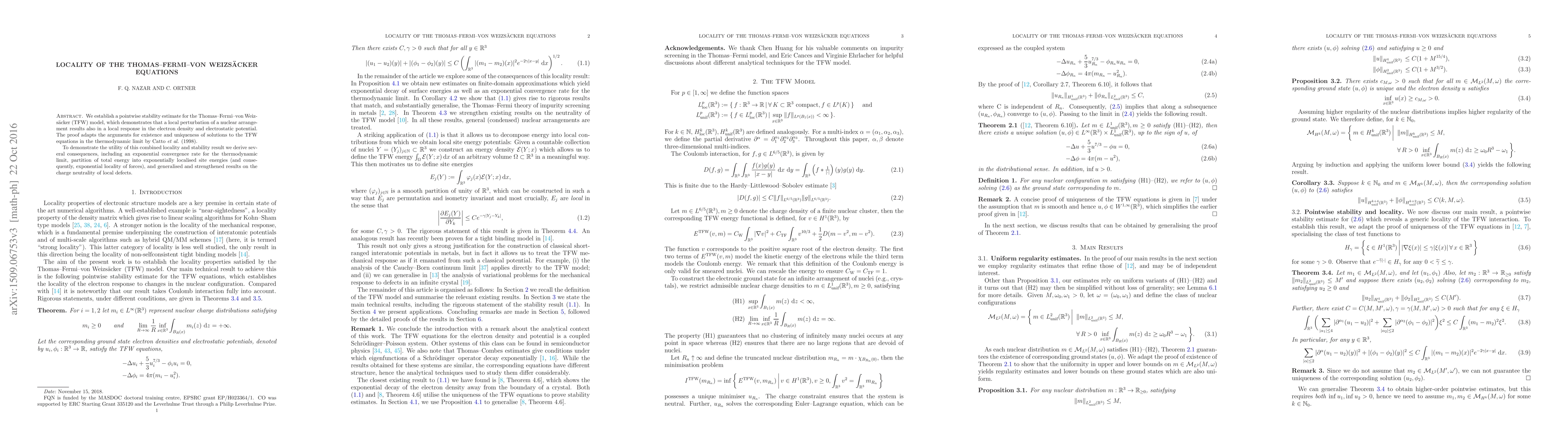 This paper establishes a pointwise stability estimate for the Thomas-Fermi-von Weizsäcker (TFW) model, showing that local perturbations in nuclear arrangements lead to local responses in electron density and electrostatic potential. The results also include exponential convergence rates, localised site energies, and enhanced charge neutrality of local defects.